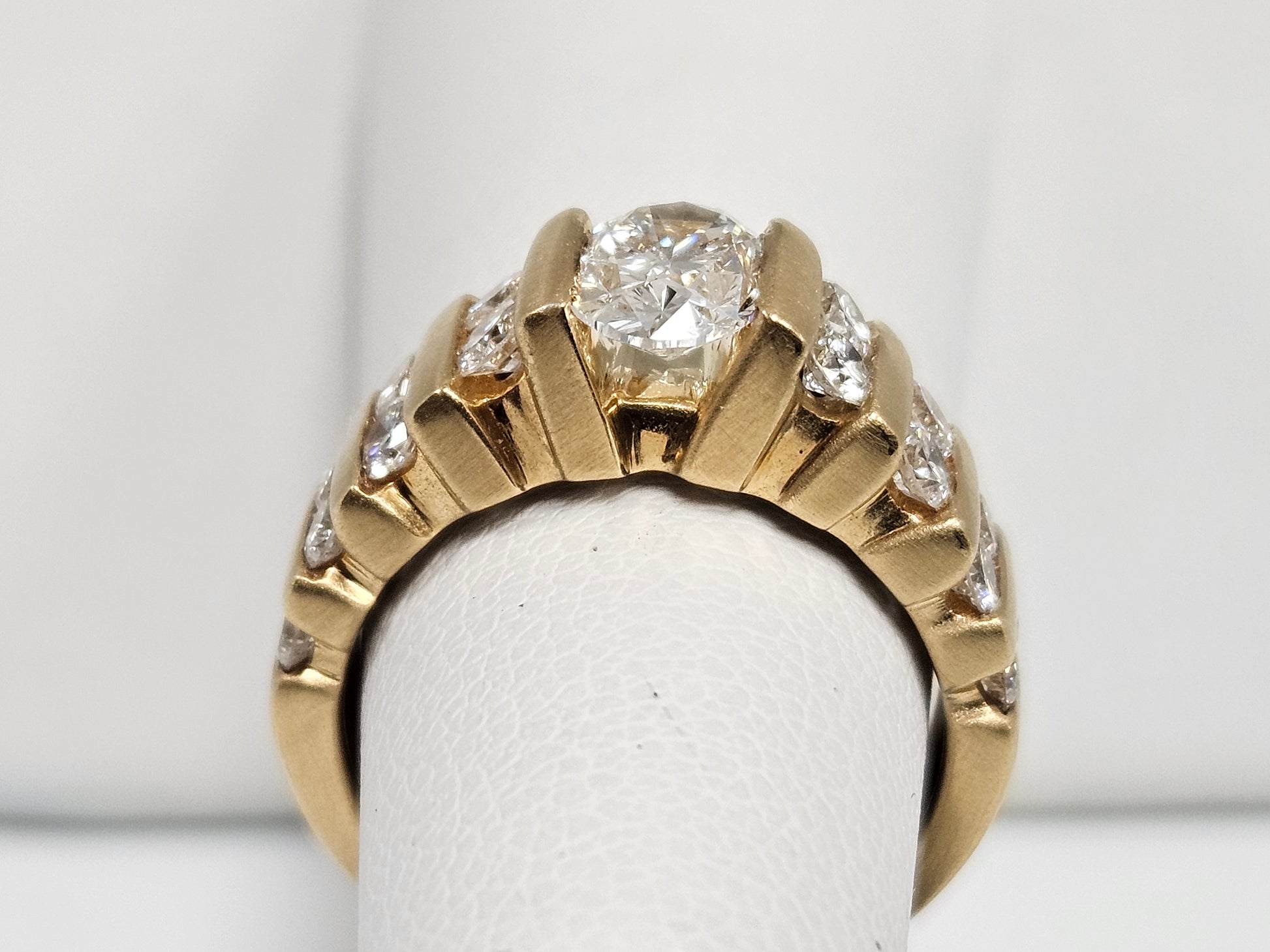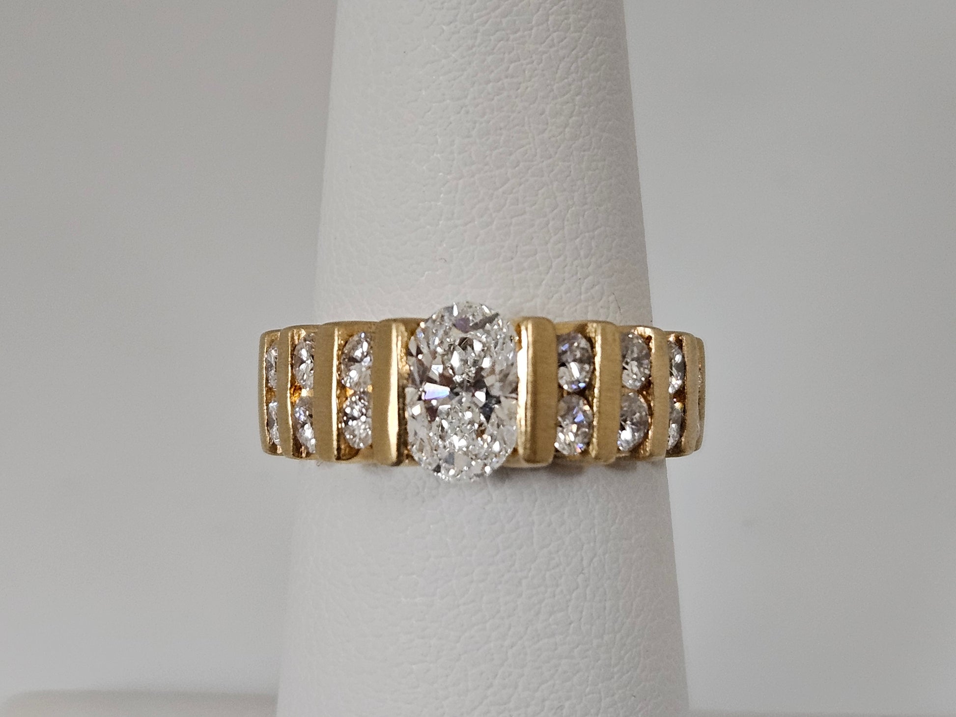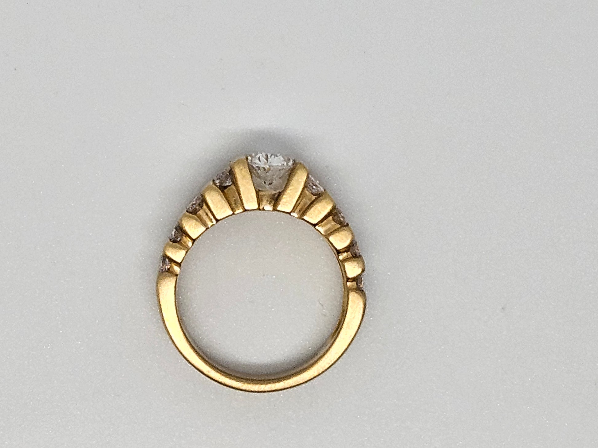 Vienna Jewelers presents a beautifu; Engagement ring in 18k yellow gold. The center diamond measures .94 carats and has a F color and VS2 clarity. The ring is also accented with .79 carats of round diamonds. This ring is sure to make a statement on your finger and is perfect for the bride-to-be who wants a classic and elegant engagement ring.