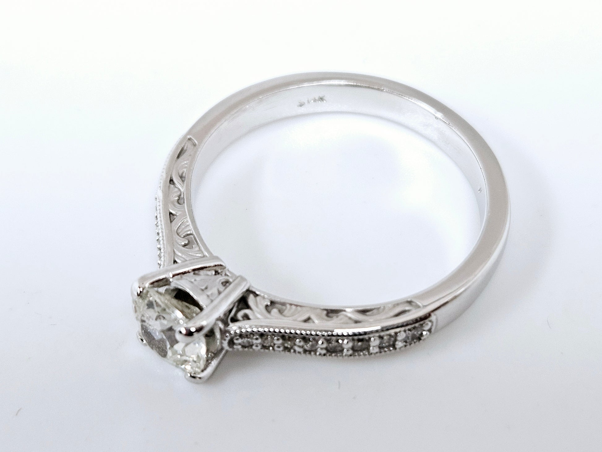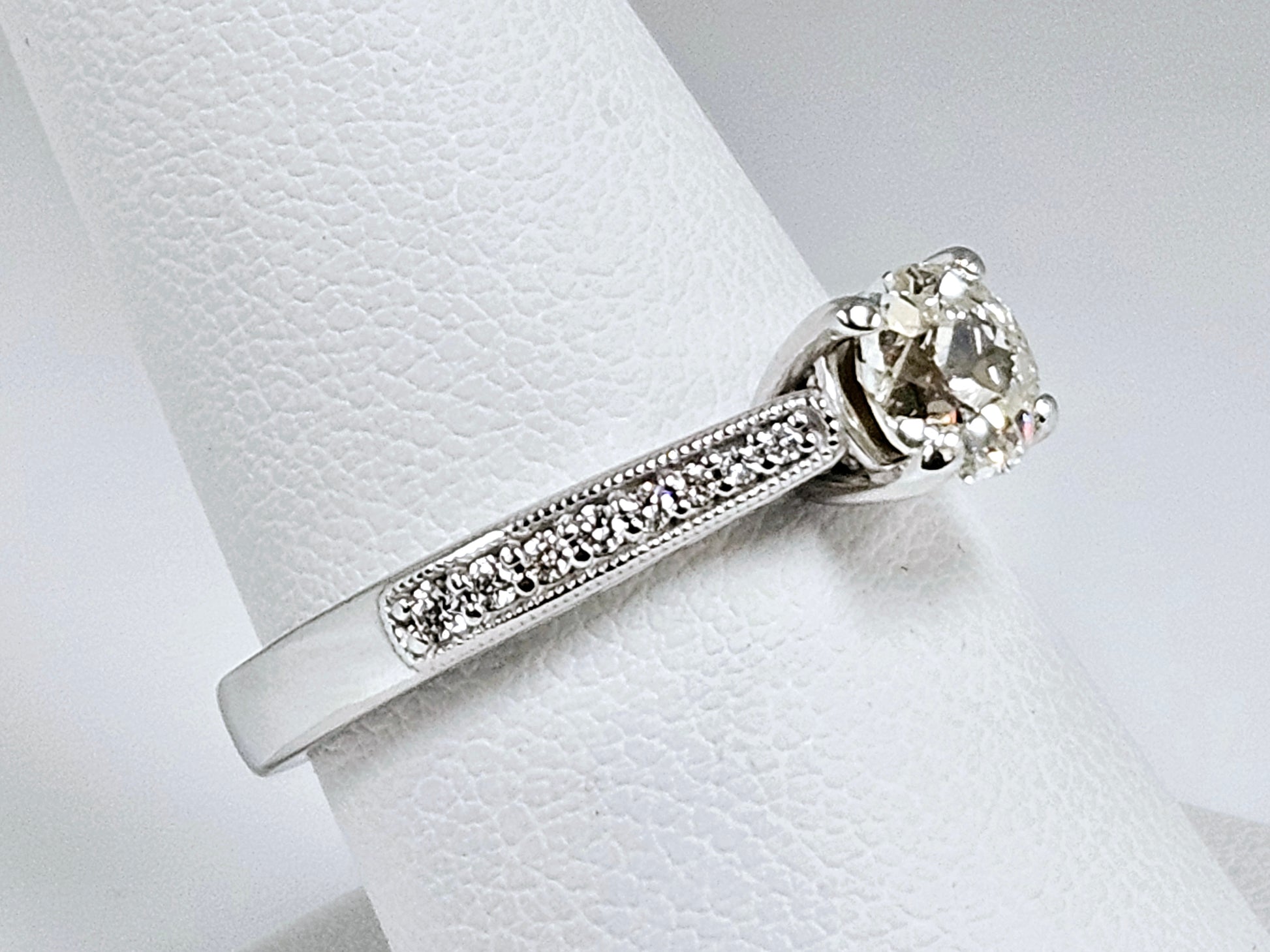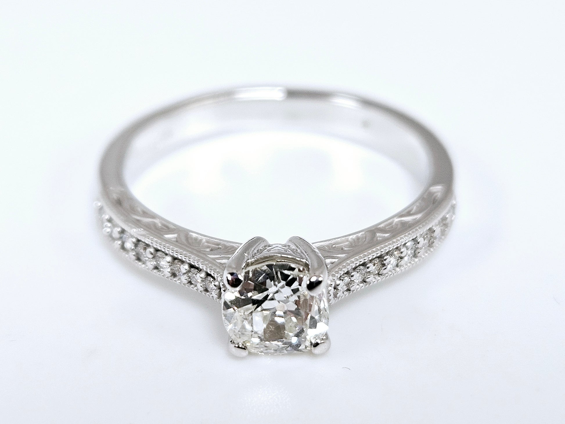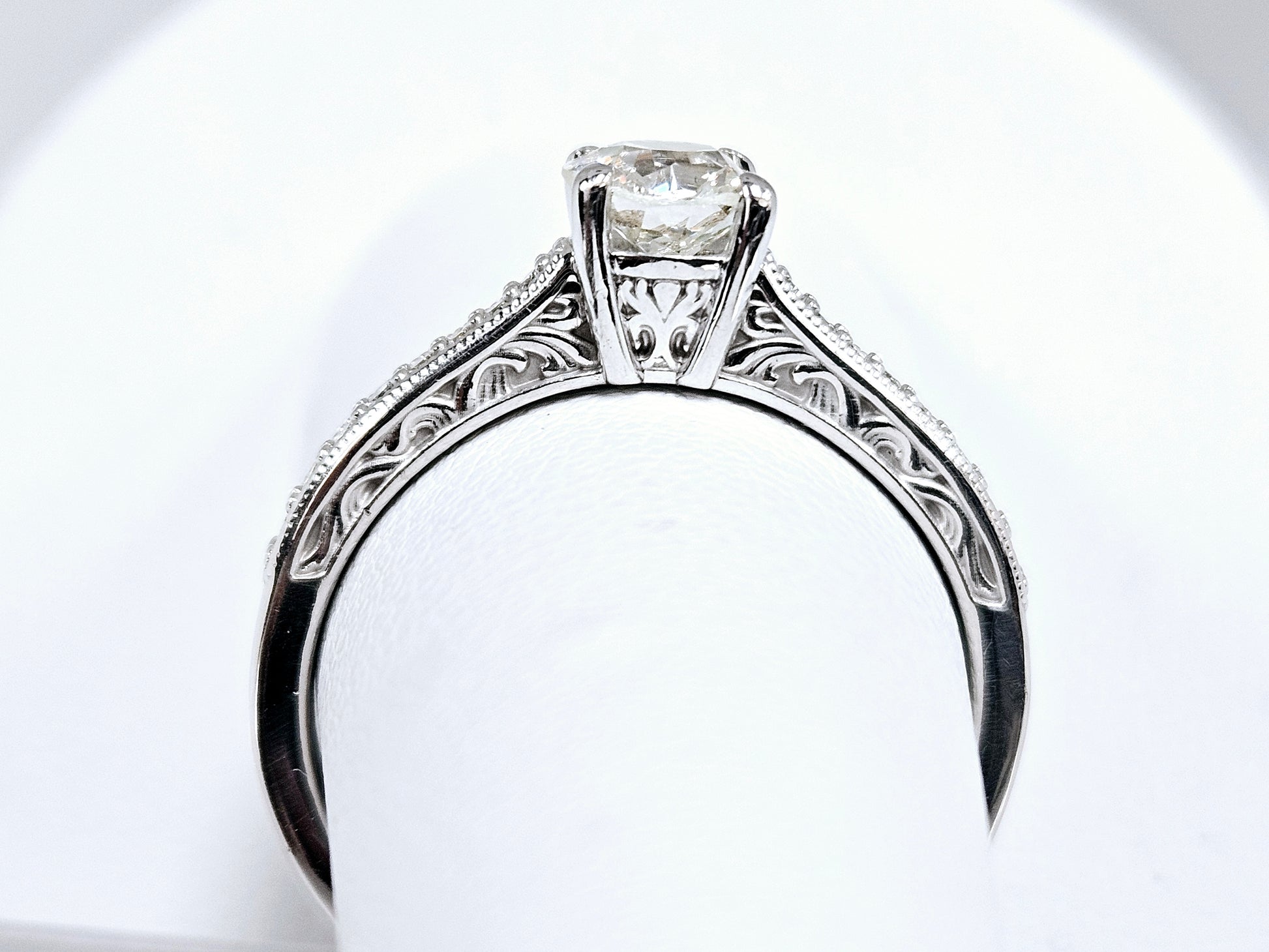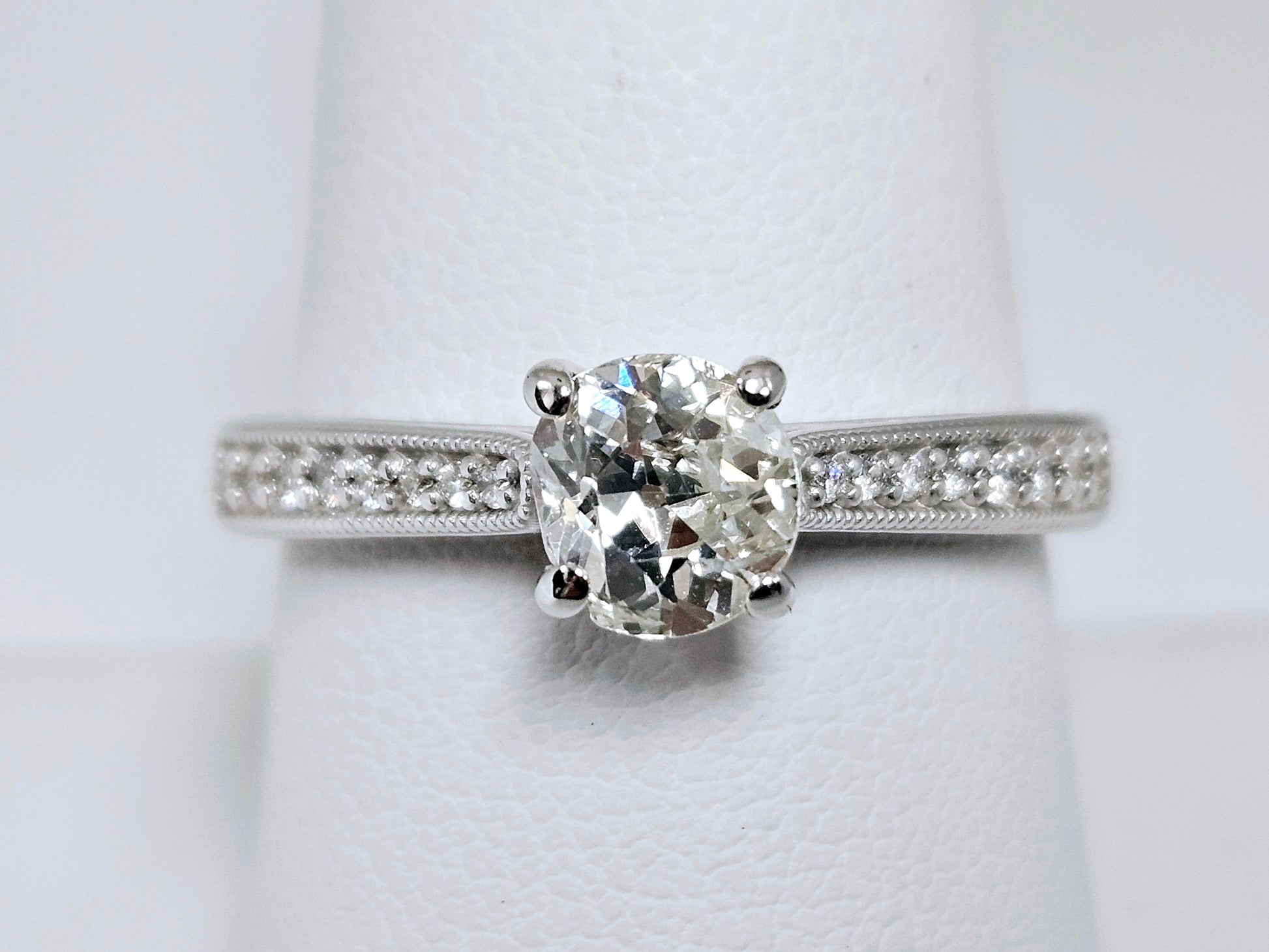 Experience the timeless, Vintage, elegance and brilliance of our Old European Engagement Ring. Crafted in 14KT white gold, this ring features a stunning 1 carat round cut diamond with an accented, beaded band, giving it a unique and vintage feel. The diamond is graded at J color and VS1 clarity, guaranteeing its exceptional quality. Elevate your love story with this exquisite ring.