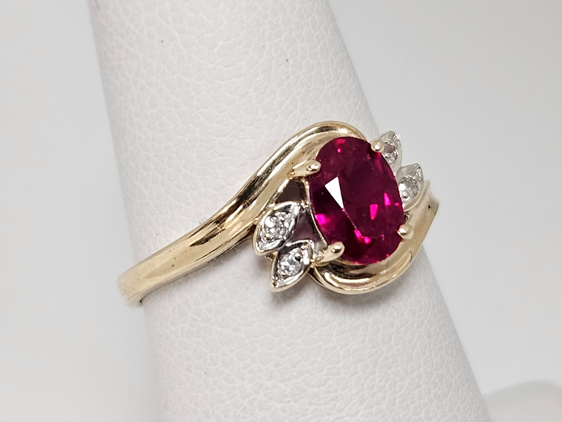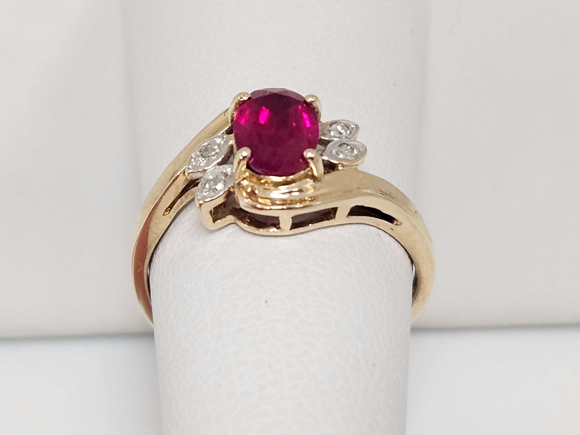 This 1 carat oval lab ruby 10kt yellow gold bypass ring is accompanied by .02 carat diamonds for added sparkle. Expertly crafted with precision and elegance, this ring is the perfect addition to any jewelry collection. Upgrade your style with this stunning piece.