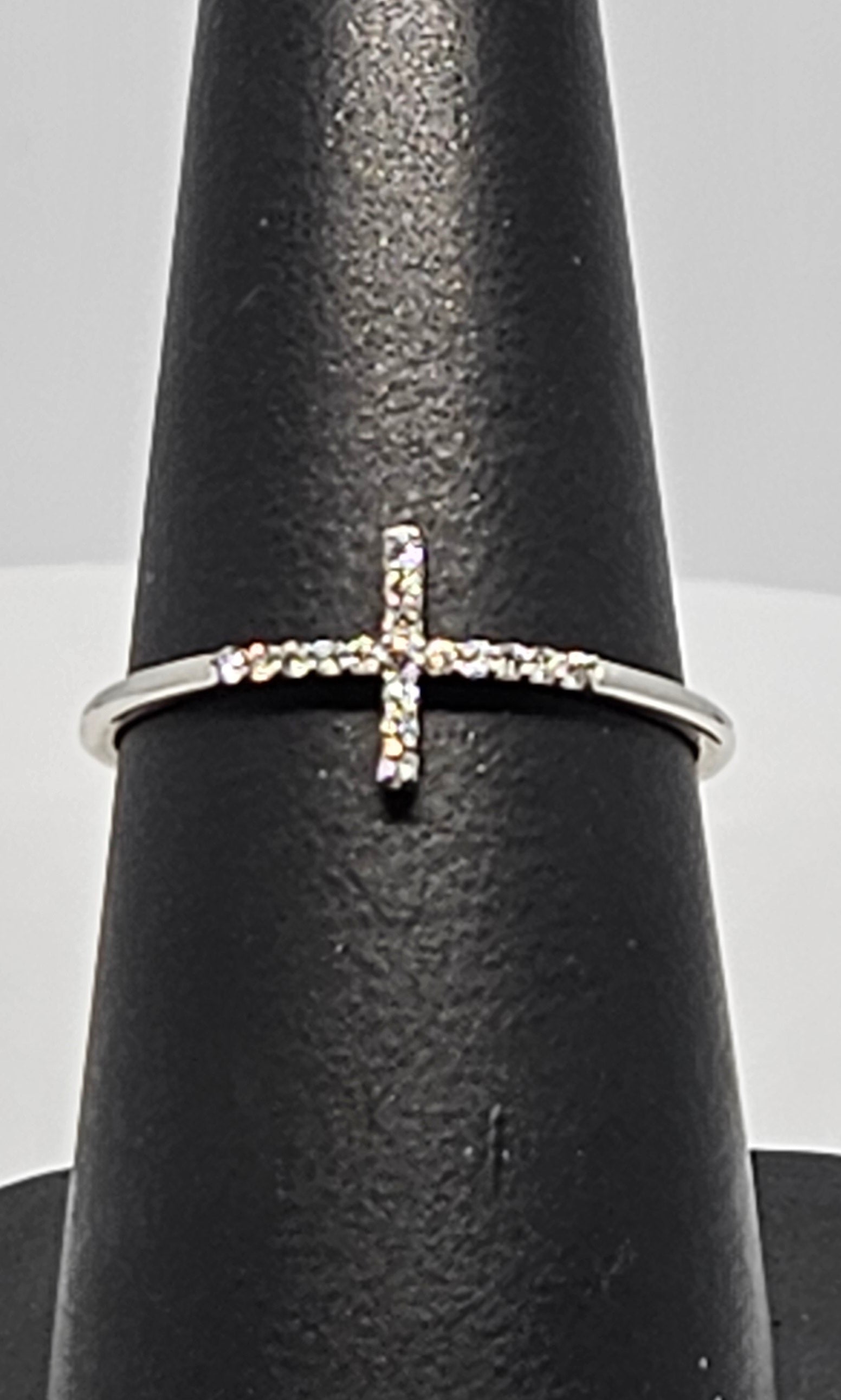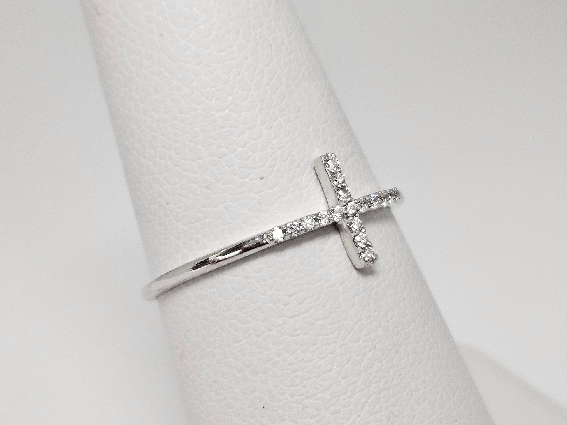 This 10kt white gold ring features a sideways cross design with a stunning .10ct total weight diamond. A perfect combination of modern and classic, this ring is sure to make a statement. Available in size 7.
