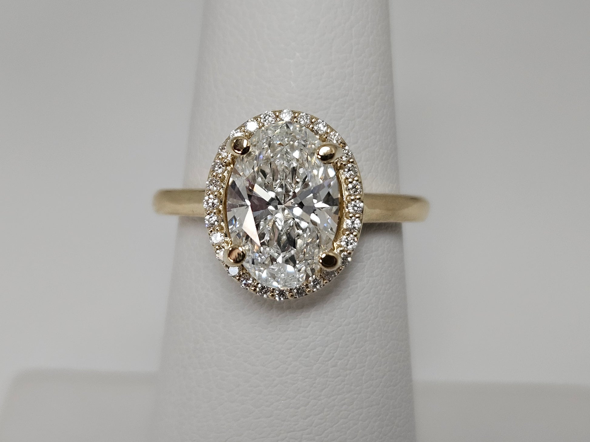 Upgrade your jewelry collection with this stunning 2.09 carat oval diamond engagement ring. The brilliant 2.19 carat total weight and 14K yellow gold setting provide a sophisticated and luxurious look. The diamond halo adds extra sparkle and highlights the center diamond for a truly elegant piece.