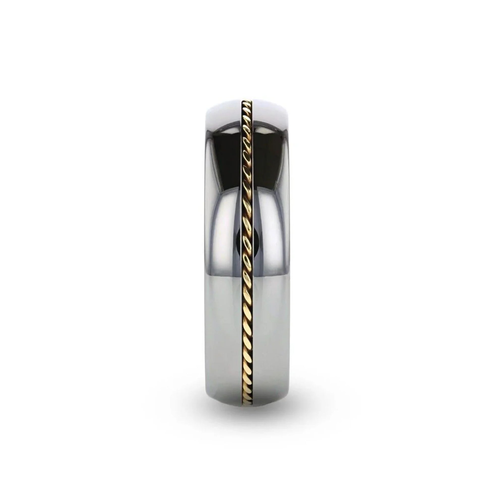 This 6mm domed tungsten ring features an intricate 14k gold braided inlay, blending durability with elegant craftsmanship. Its modern design offers both strength and a distinguished look, ideal for those seeking a refined yet resilient accessory.