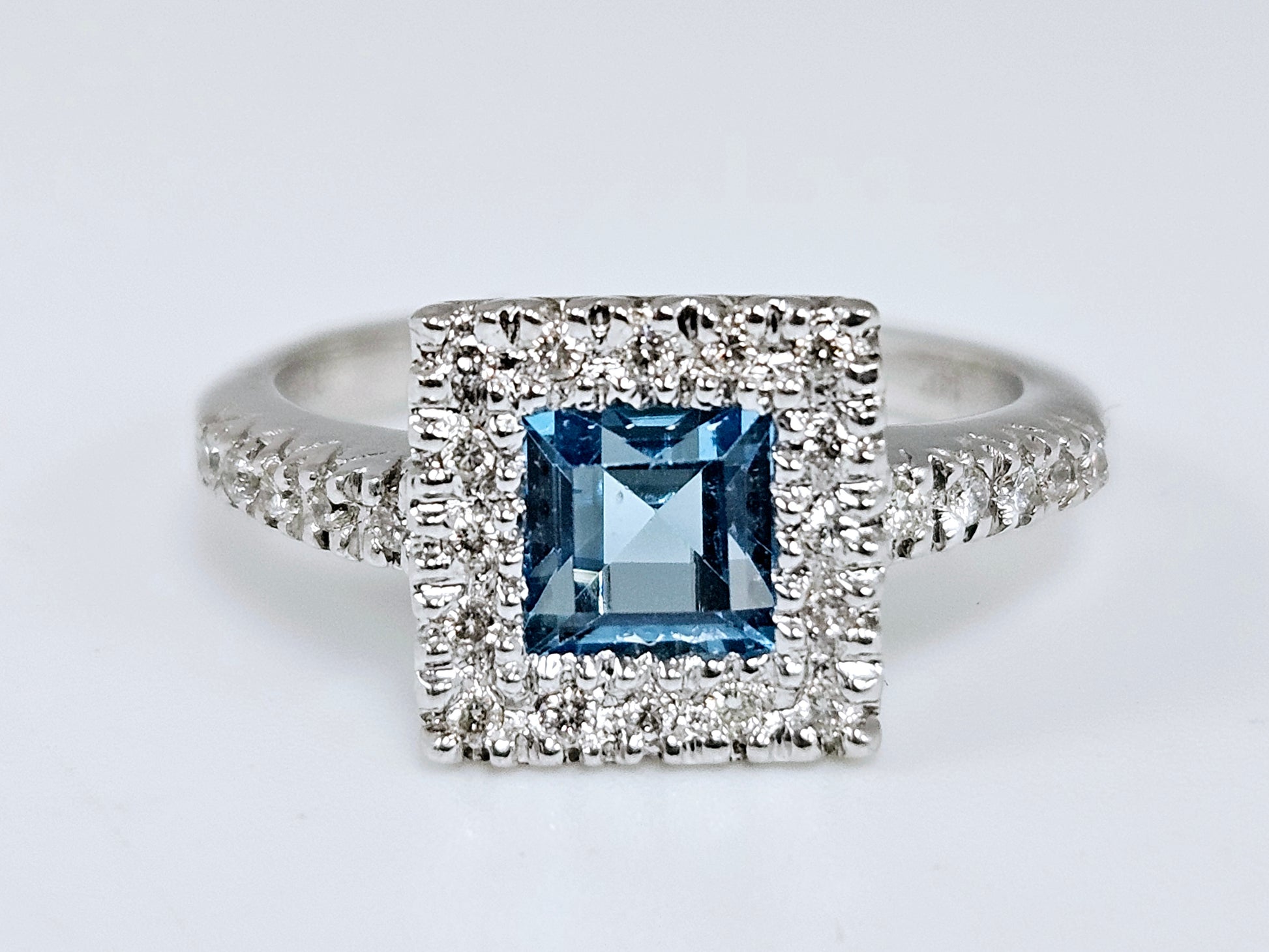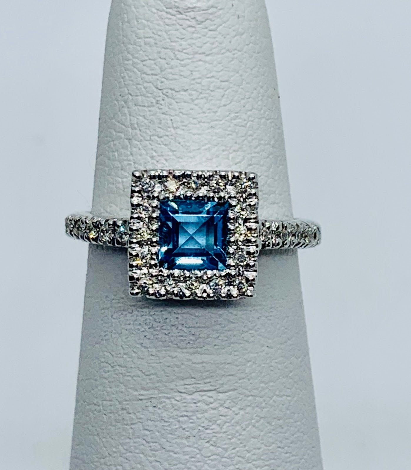 This stunning square blue topaz ring is expertly crafted in 14k white gold and features a sparkling .75ct blue topaz gemstone surrounded by a halo of 0.25ct diamonds. With its elegant design and high-quality materials, this ring is sure to make a statement and add a touch of sophistication to any outfit.