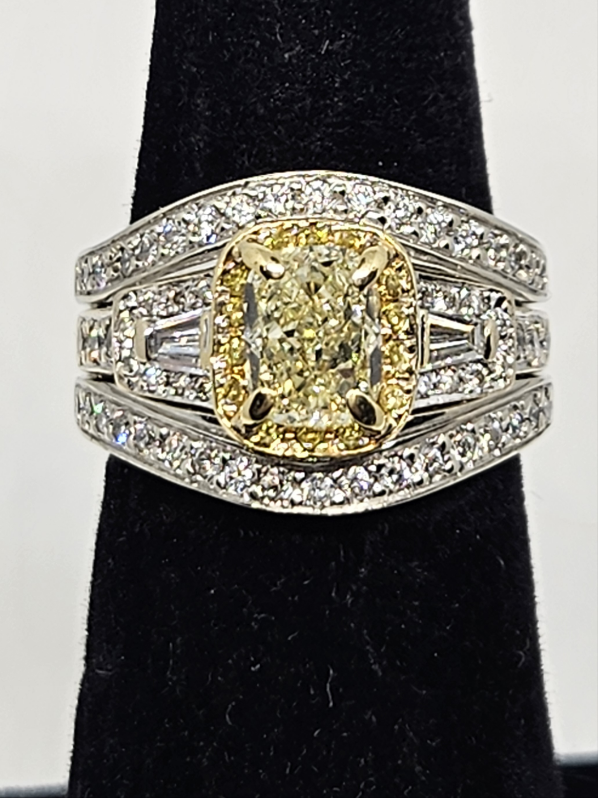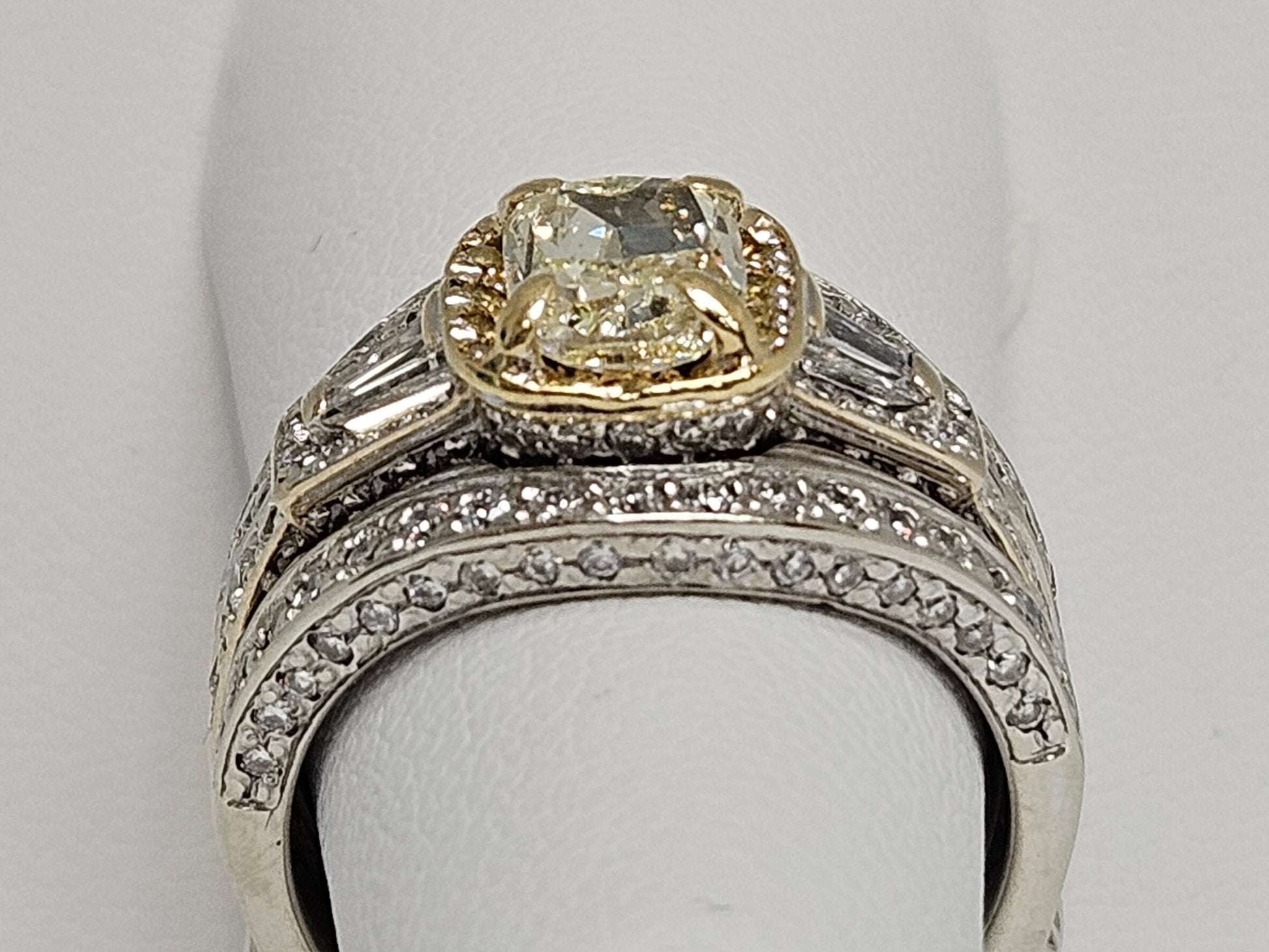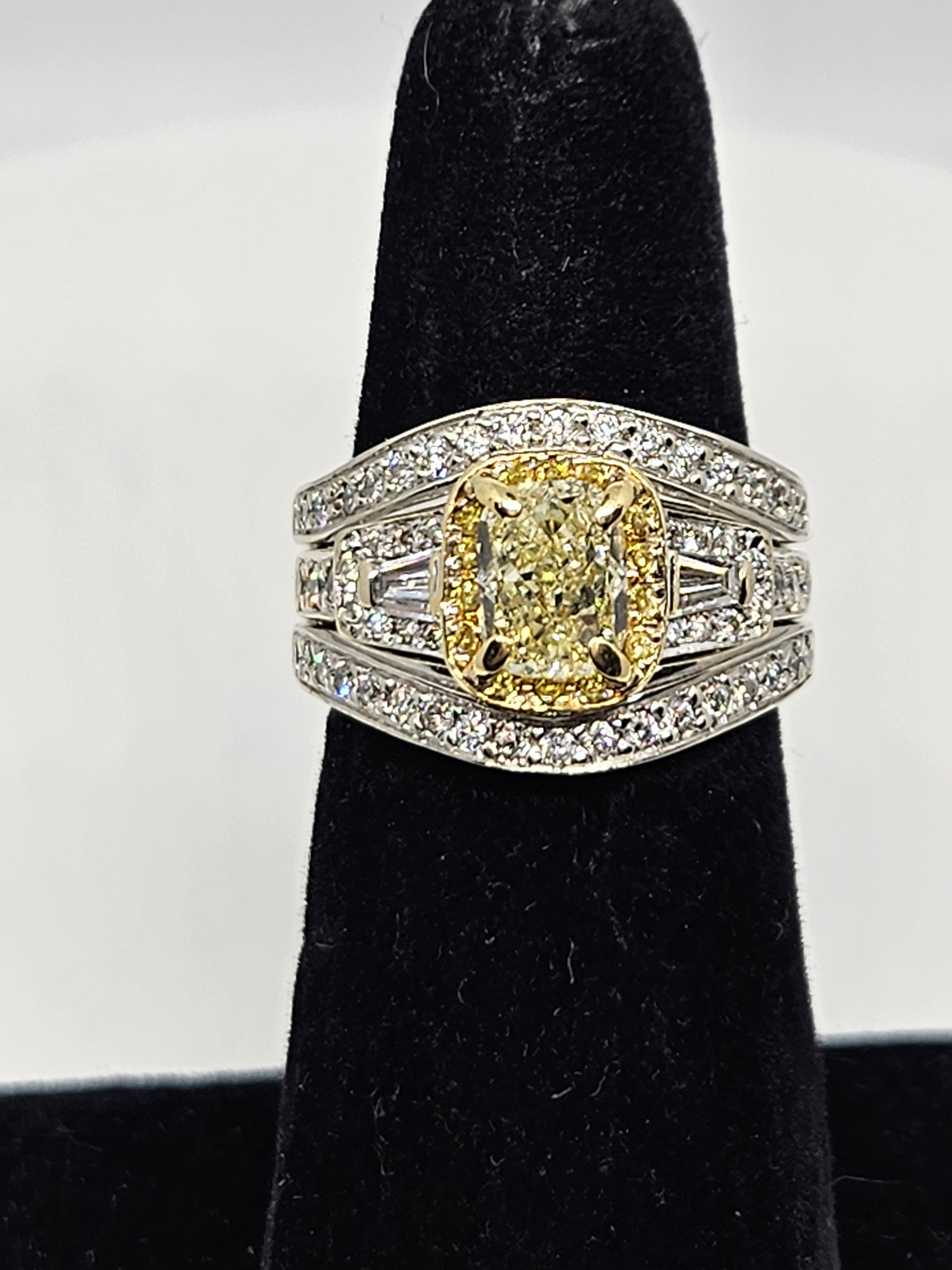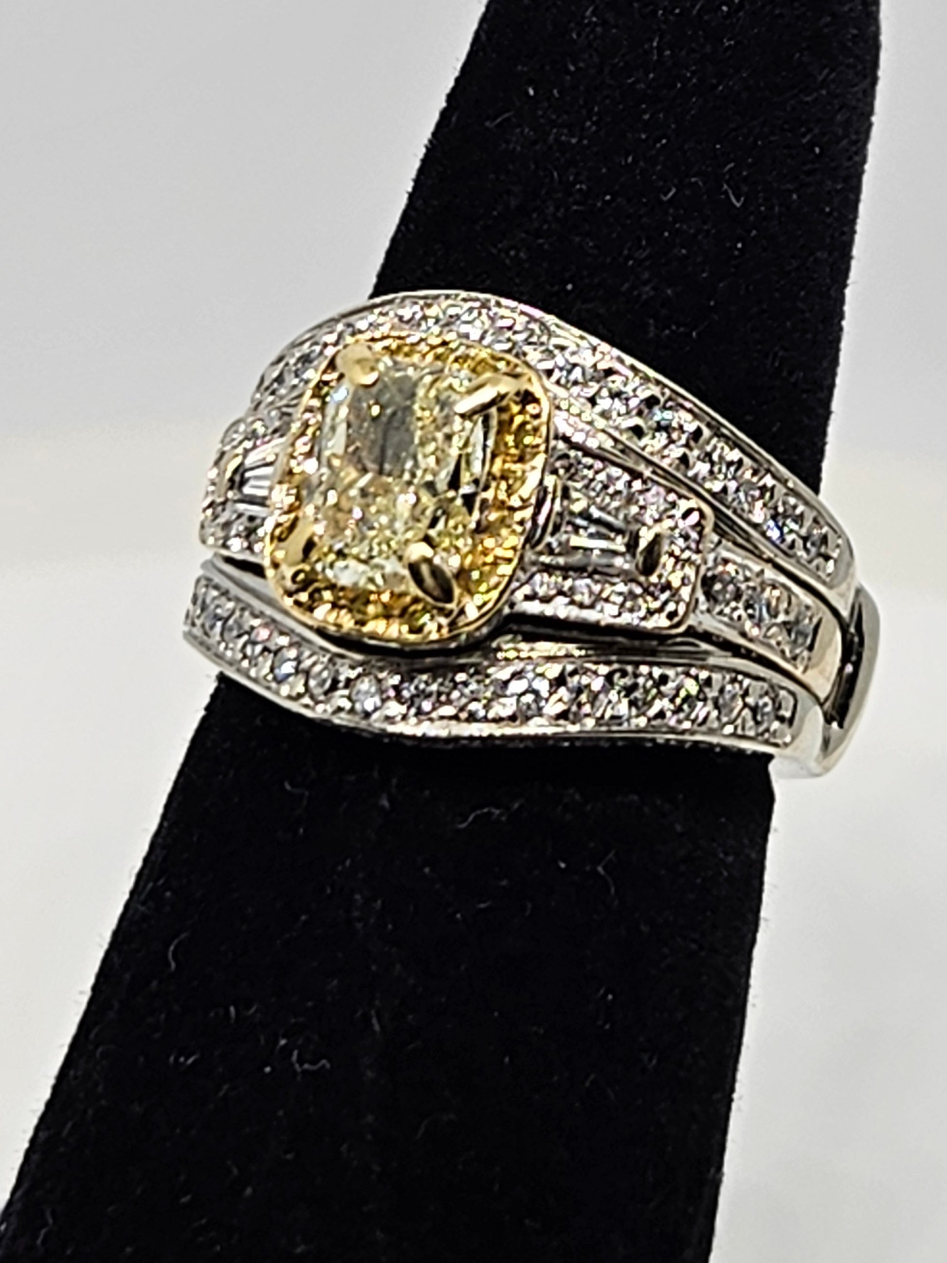 This stunning two-tone ring set features a brilliant GIA - 1.23 carat Canary Diamond in the center, surrounded by a jacket ring of smaller diamonds. The ring is made of 18k yellow and white gold, and is perfect for any special occasion. The canary diamond is a rare and beautiful gem, with a warm yellow hue that is sure to turn heads. The smaller diamonds add sparkle and shine, and the two-tone gold gives the ring a unique and stylish look. This ring is sure to be a cherished addition to any jewelry collection.