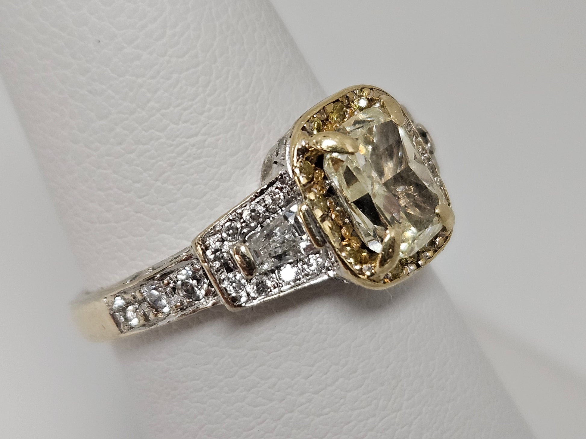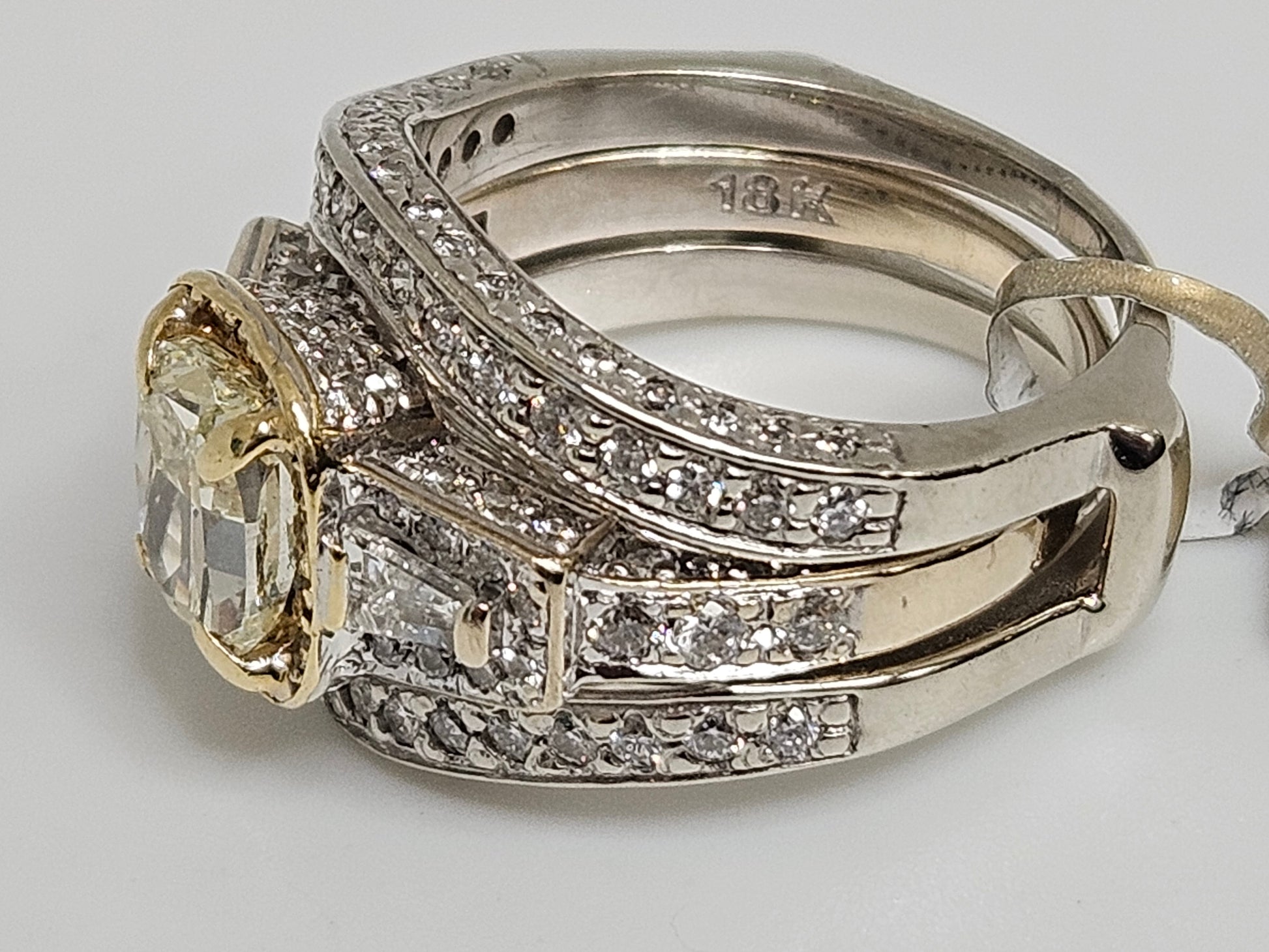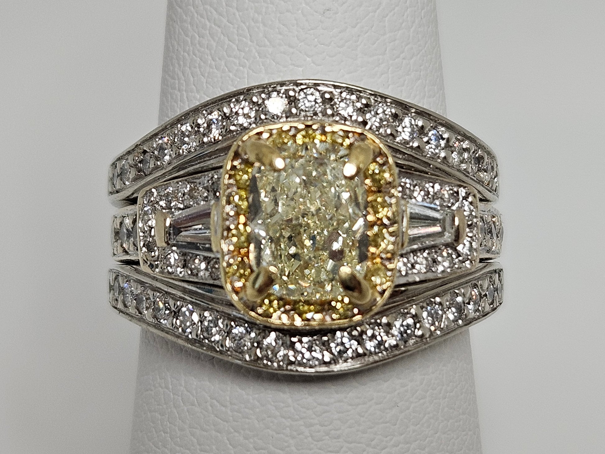 This stunning two-tone ring set features a brilliant GIA - 1.23 carat Canary Diamond in the center, surrounded by a jacket ring of smaller diamonds. The ring is made of 18k yellow and white gold, and is perfect for any special occasion. The canary diamond is a rare and beautiful gem, with a warm yellow hue that is sure to turn heads. The smaller diamonds add sparkle and shine, and the two-tone gold gives the ring a unique and stylish look. This ring is sure to be a cherished addition to any jewelry collection.