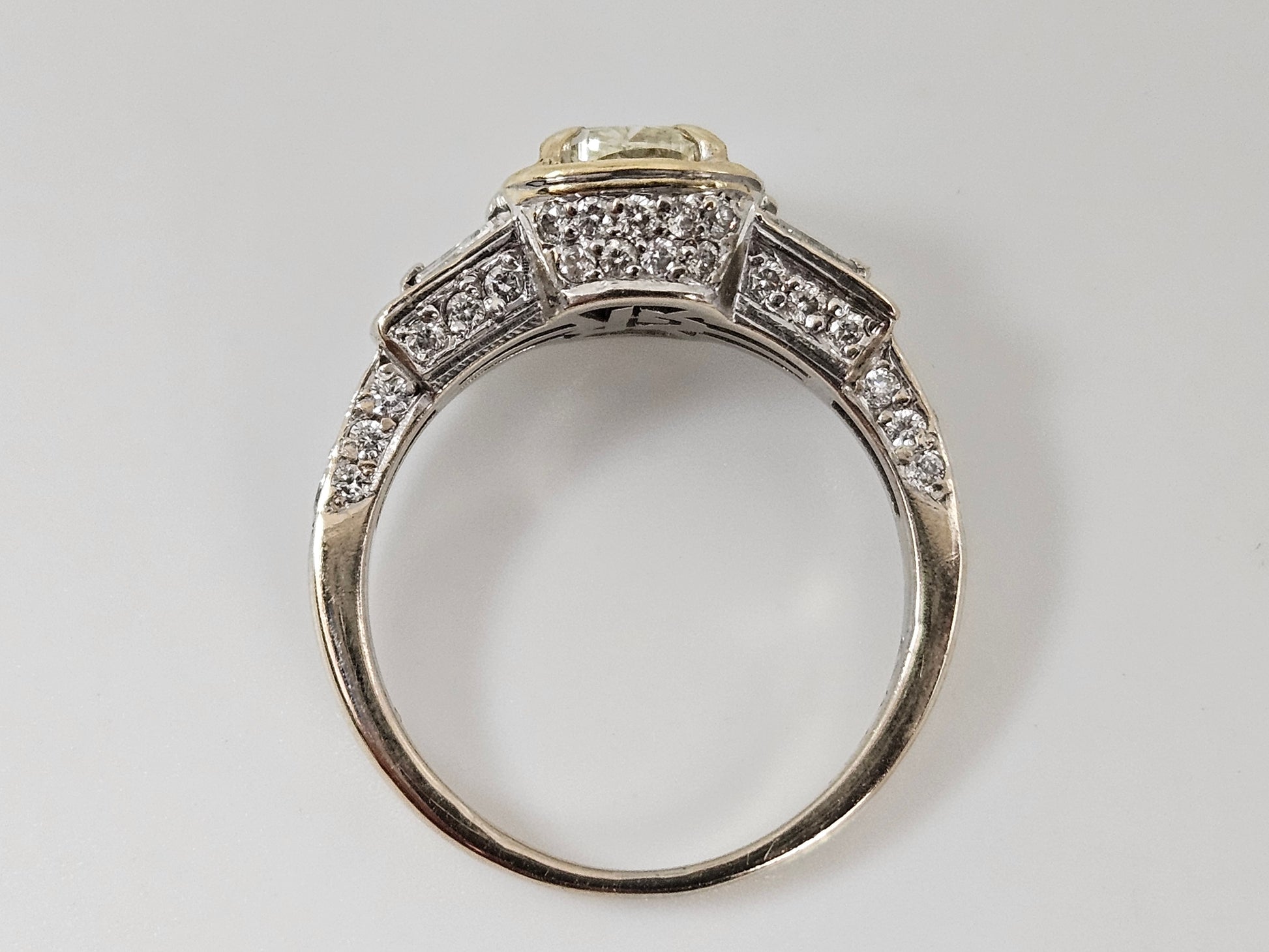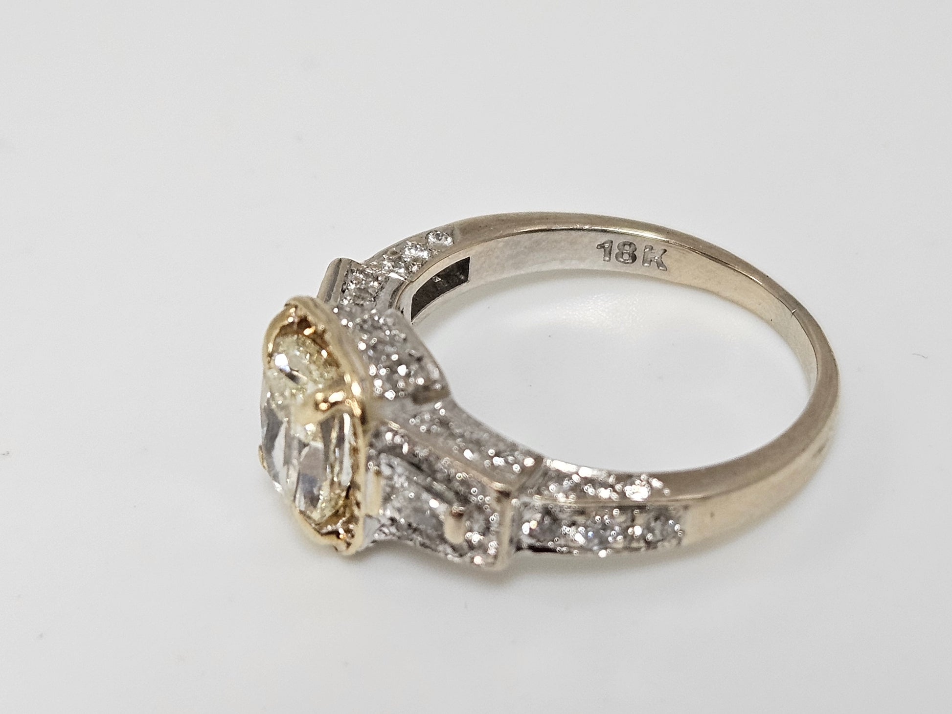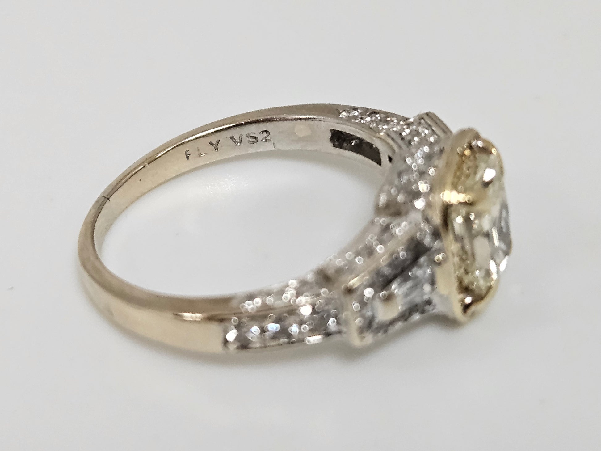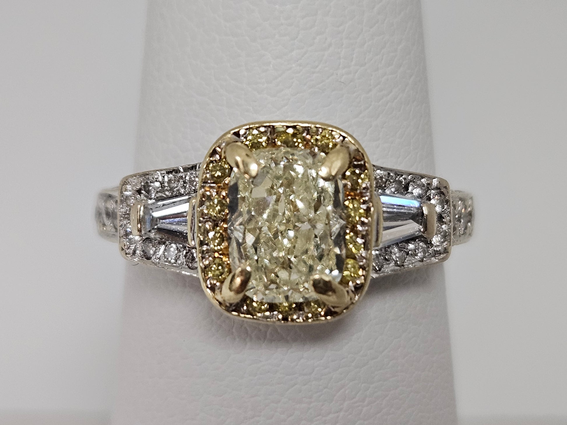 This stunning two-tone ring set features a brilliant GIA - 1.23 carat Canary Diamond in the center, surrounded by a jacket ring of smaller diamonds. The ring is made of 18k yellow and white gold, and is perfect for any special occasion. The canary diamond is a rare and beautiful gem, with a warm yellow hue that is sure to turn heads. The smaller diamonds add sparkle and shine, and the two-tone gold gives the ring a unique and stylish look. This ring is sure to be a cherished addition to any jewelry collection.