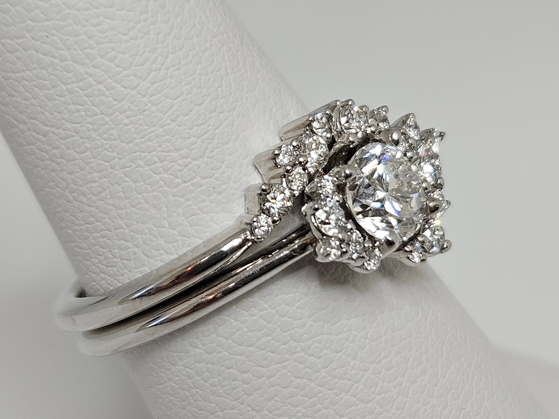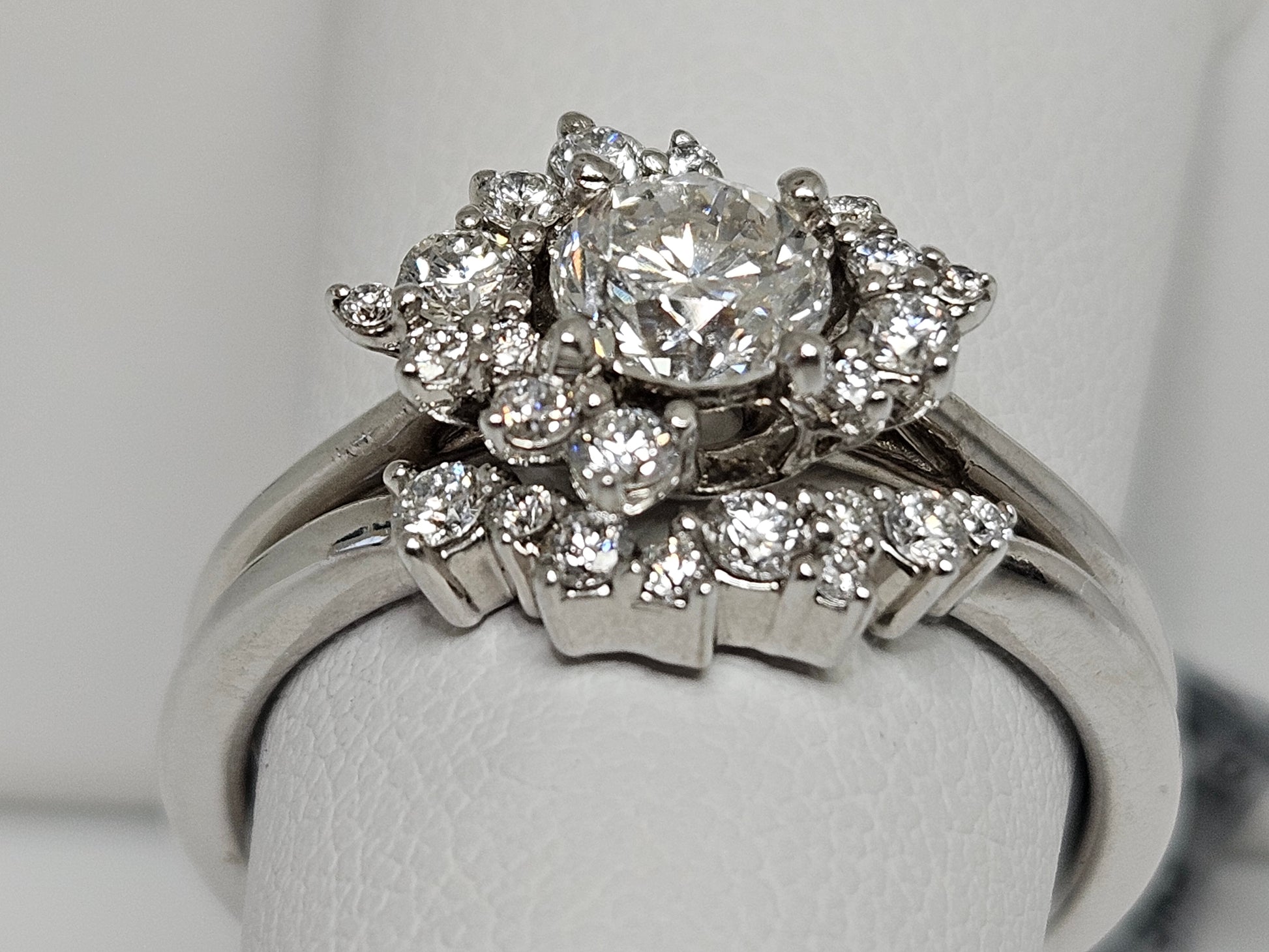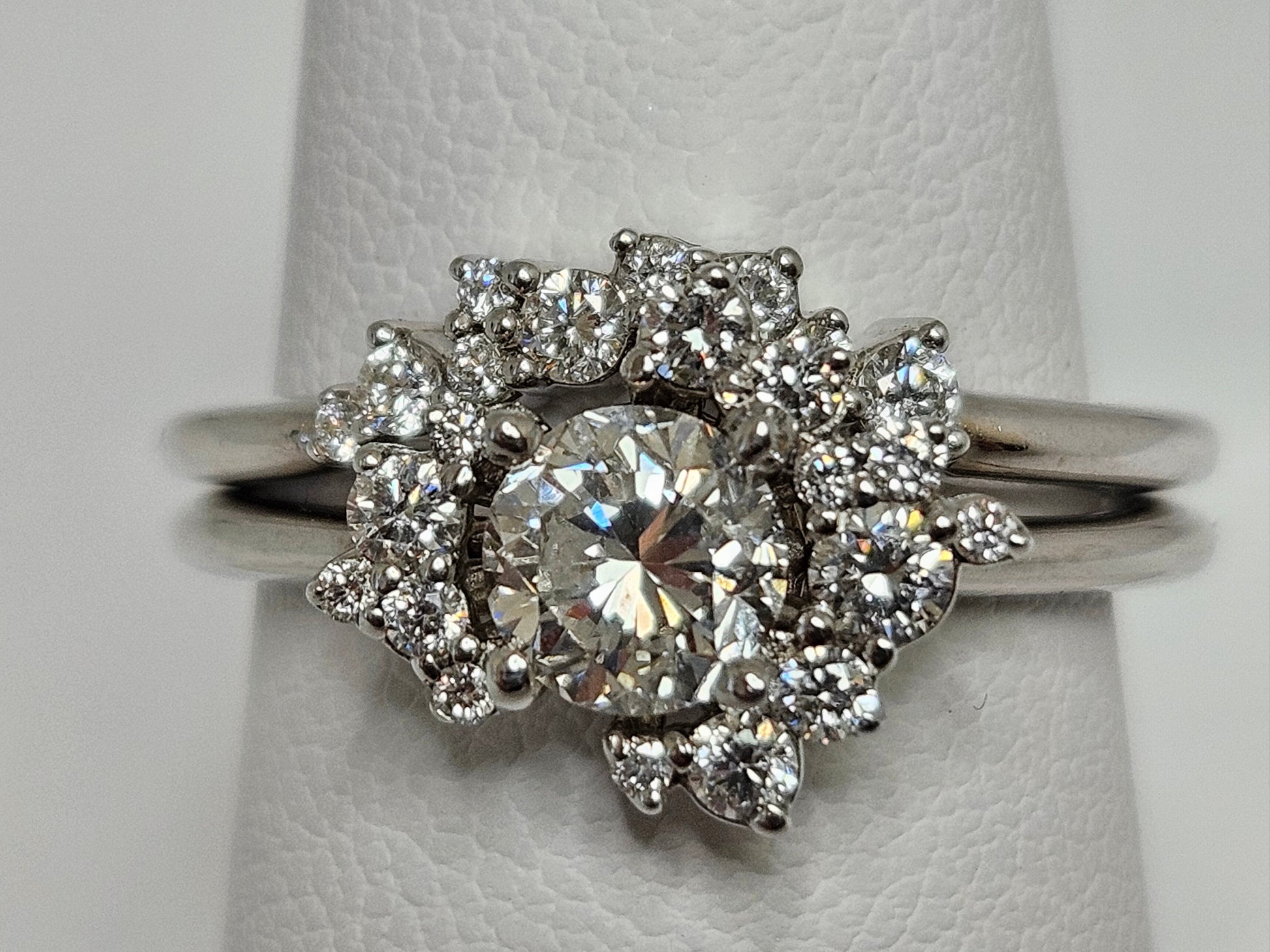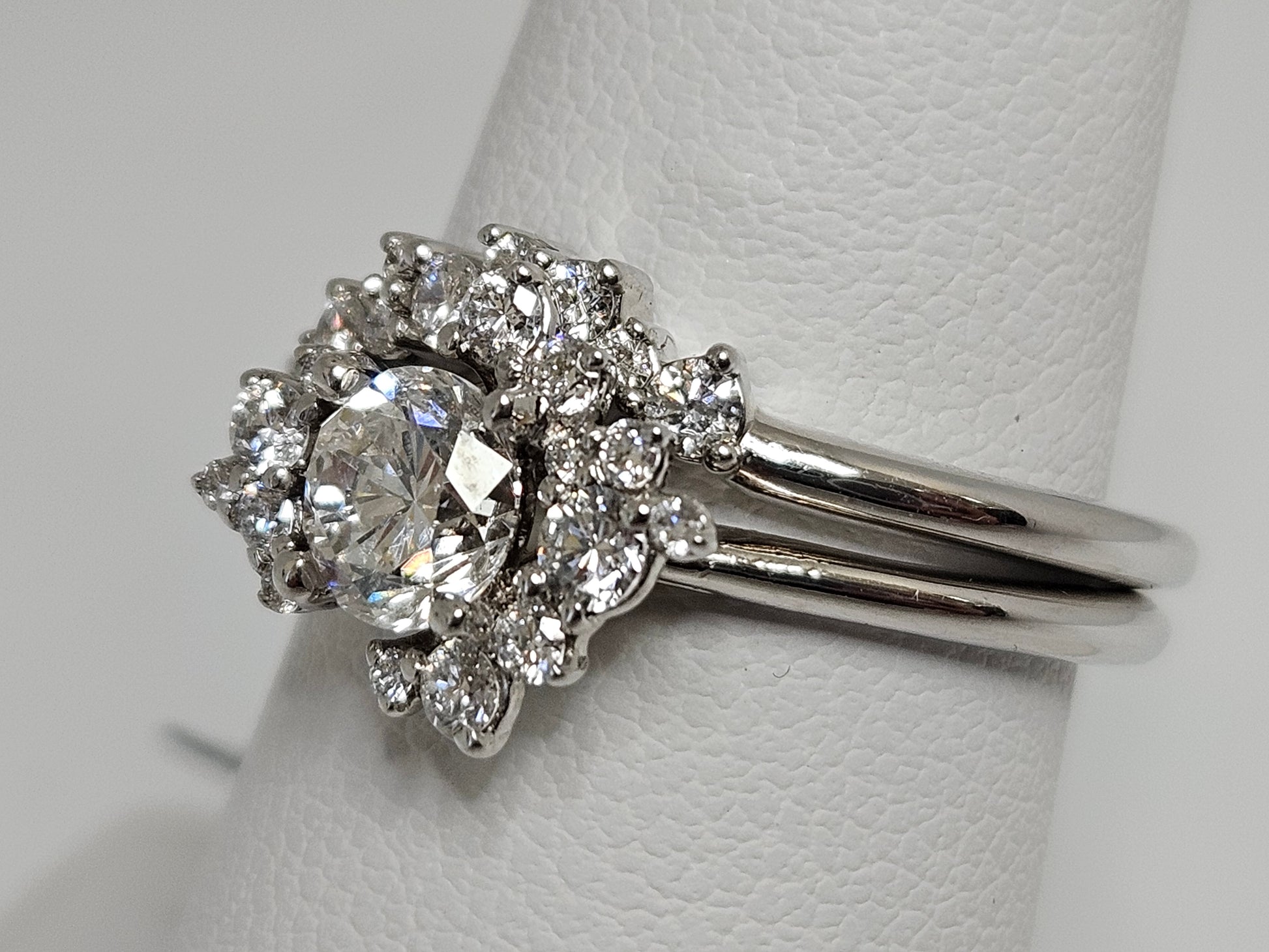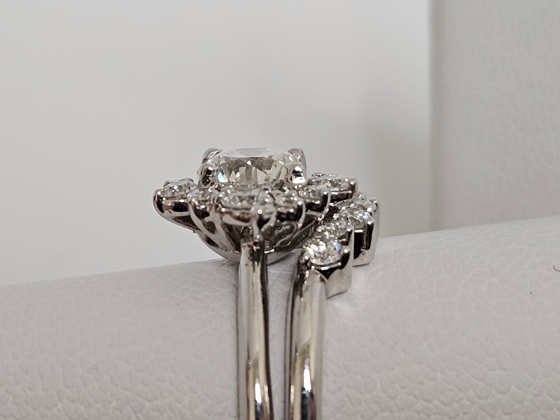 This Celestial Engagement Set features a total carat weight of 1ct and a center of .65ct natural diamond with a clarity of H and a color of SI1. Its natural beauty and brilliant design make it a timeless and elegant choice for your special day.