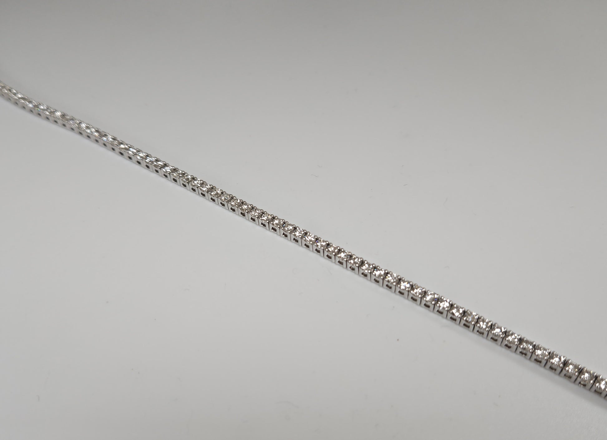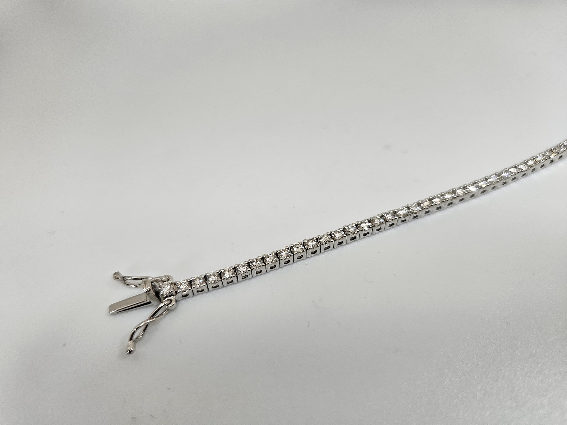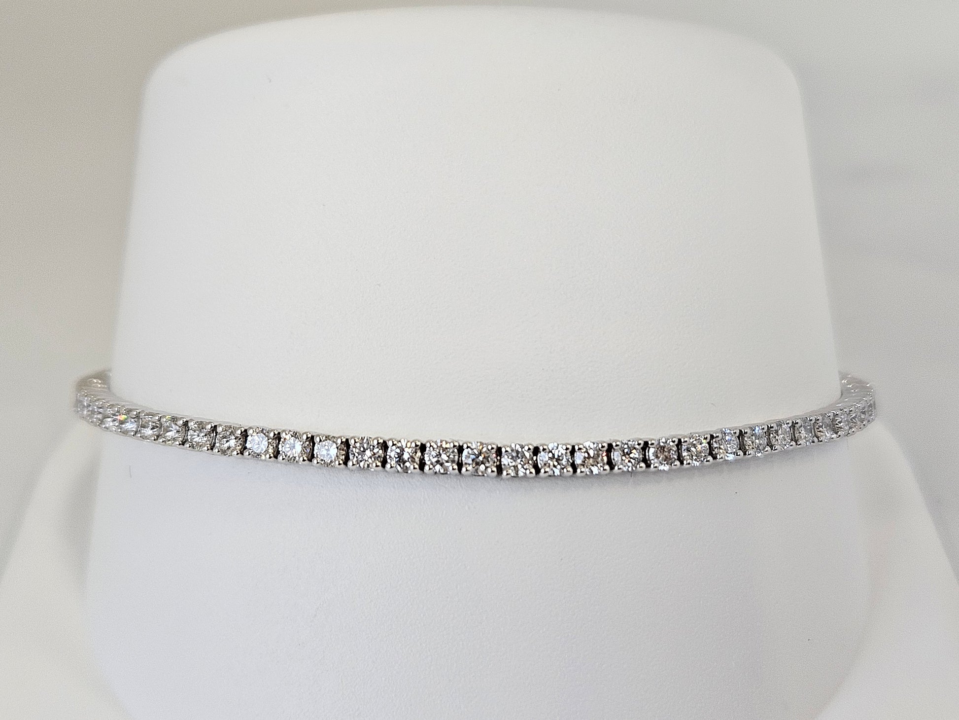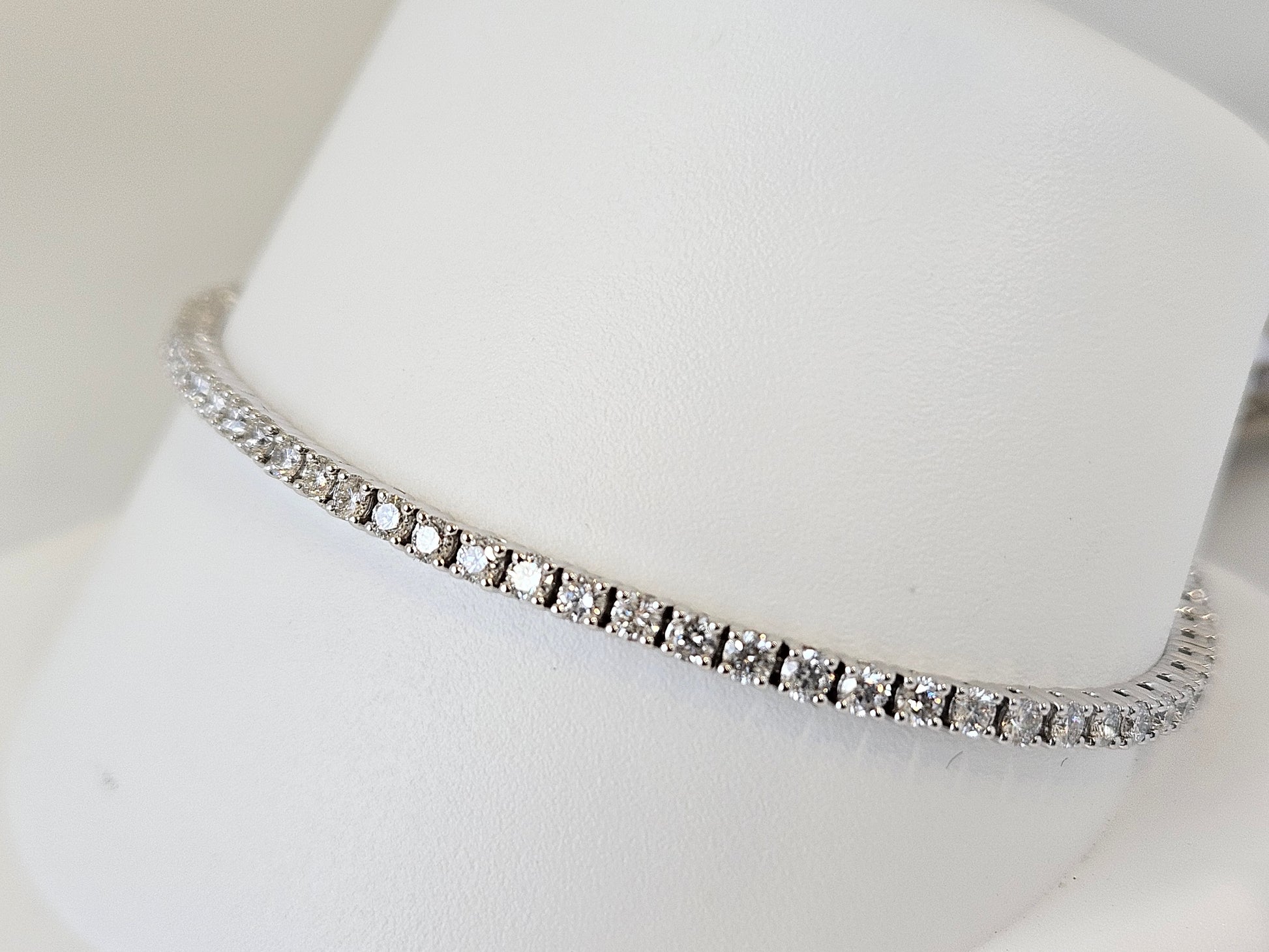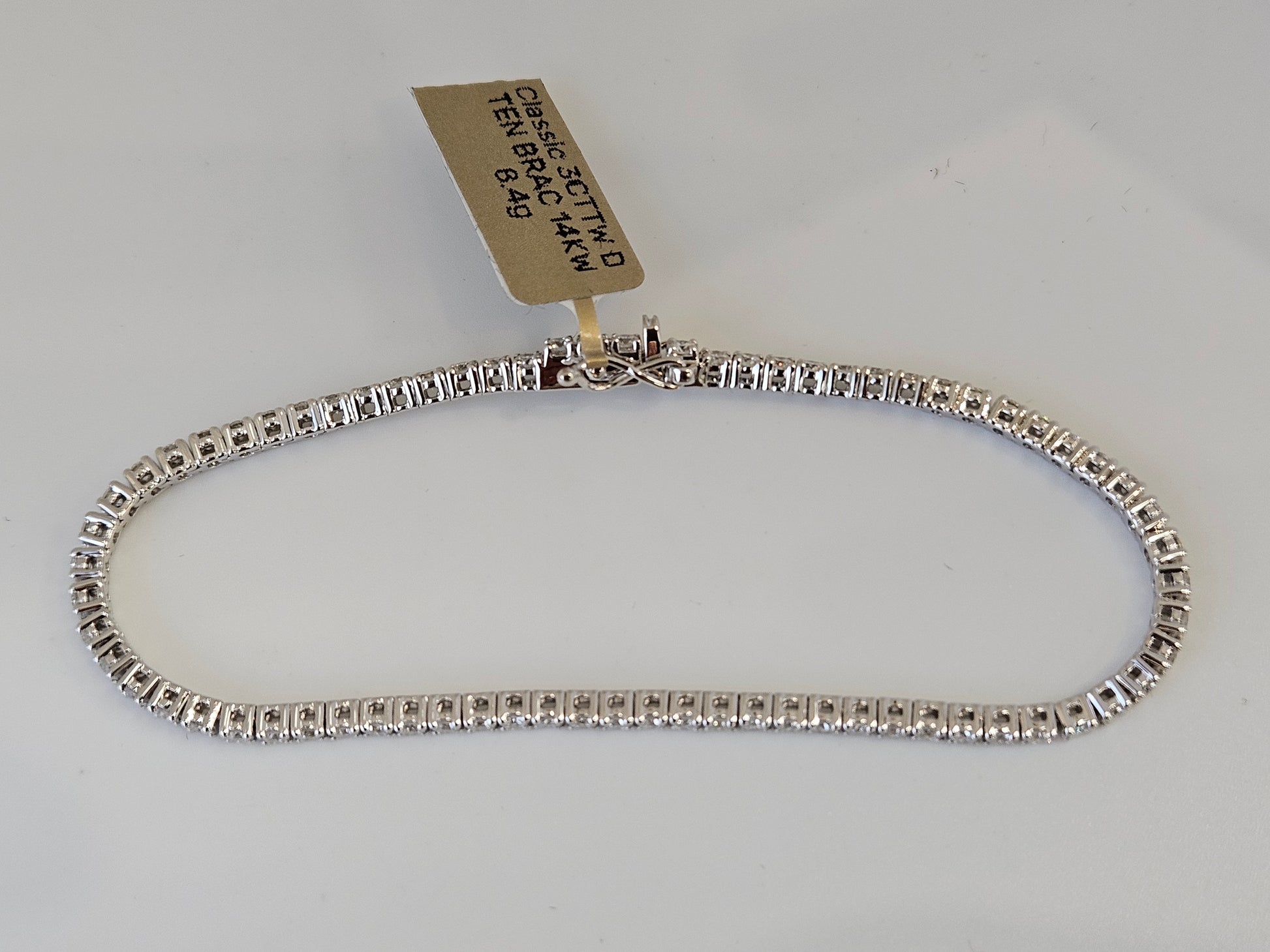 This classic 3CTTW diamond tennis bracelet in 14KWG, weighing 8.4g, exudes timeless elegance. The exquisite design showcases 3 carats of sparkling diamonds, making it a must-have for any special occasion. Crafted with high-quality materials, this bracelet is a sophisticated addition to any jewelry collection.