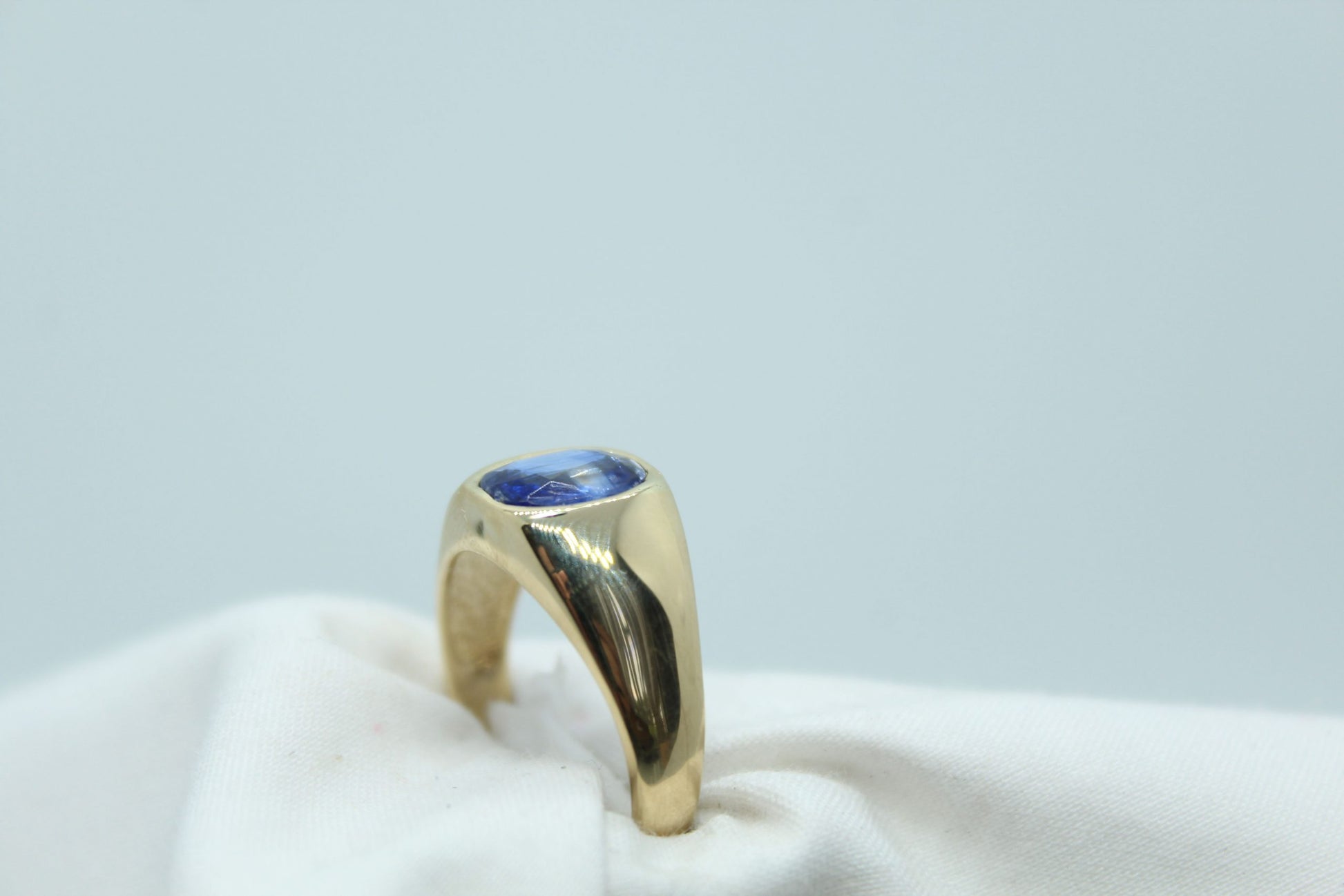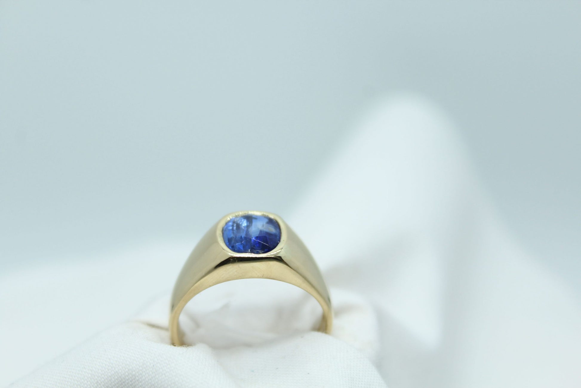 This Men's Blue Kyanite Ring showcases a stunning 1.85CT blue kyanite stone set in a 14KT yellow gold band. Kyanite is known for its soothing and calming properties, making this ring not only beautiful but also potentially beneficial for the wearer. A sophisticated and elegant addition to any jewelry collection.