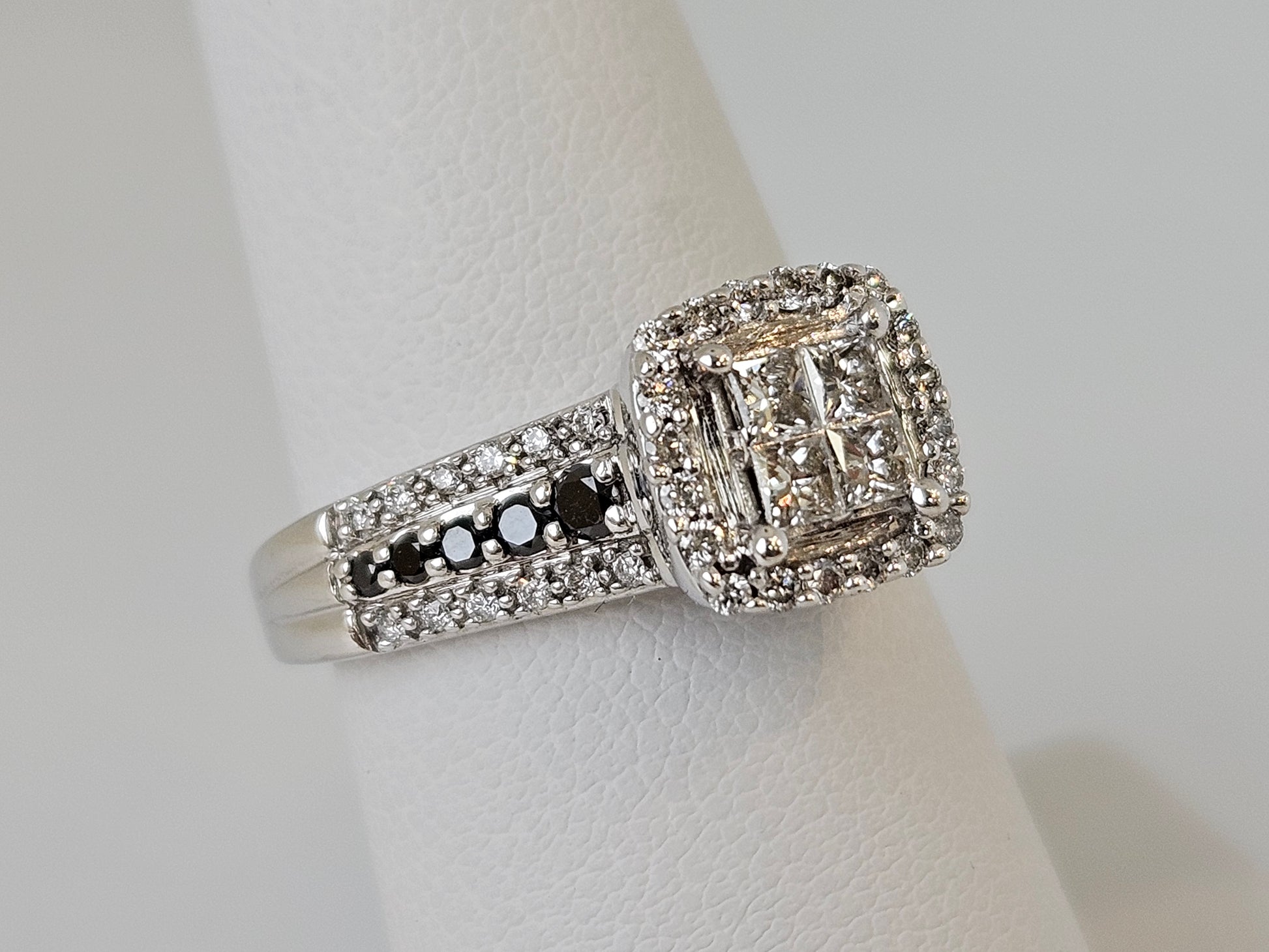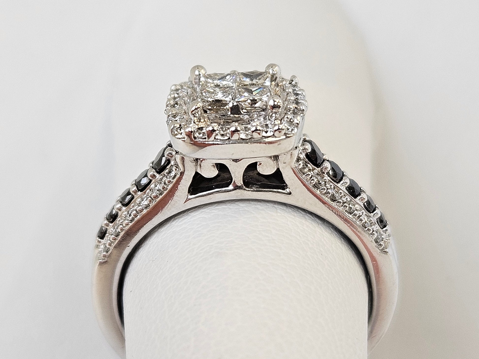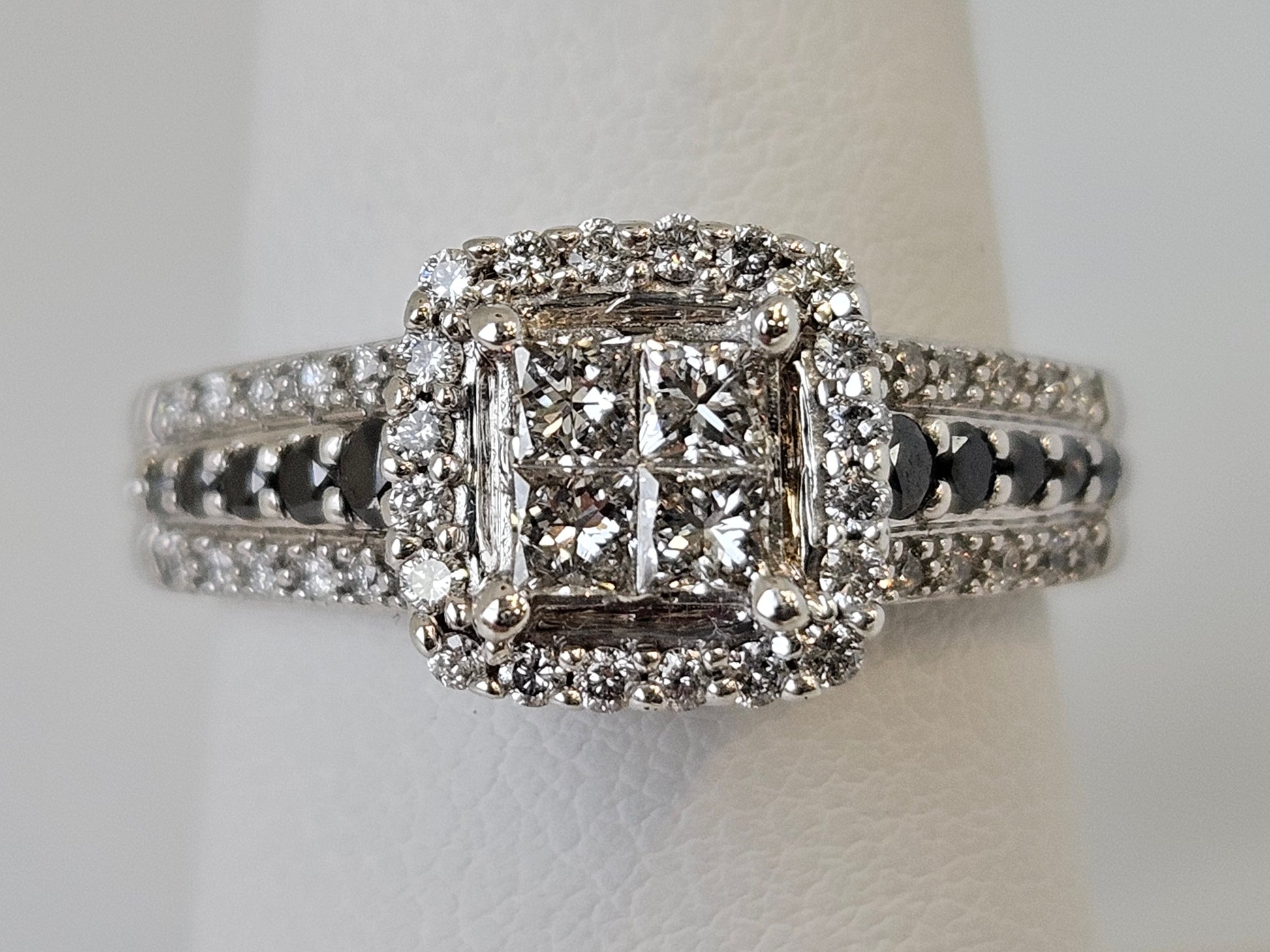 As an expert in diamond jewelry, we present the WHITE /BLACK Diamond 1cttw 14kwg Ring. This stunning halo design features a combination of white and black diamonds, creating a striking color contrast. The invisible setting creates a seamless look and enhances the sparkle of the 1cttw diamonds. Crafted in 14k white gold, this piece is a timeless and elegant addition to any jewelry collection.