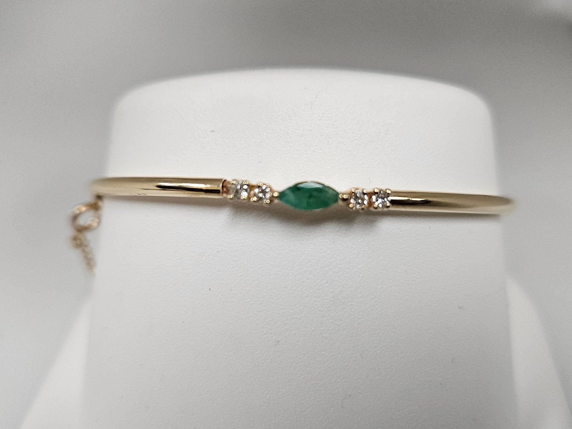 This MQ Em/Dia Bangle Bracelet is crafted with 14K yellow gold and features a stunning .35 carat emerald and .12 carat total weight diamonds. The elegant design and high-quality materials make it a perfect accessory for any occasion.