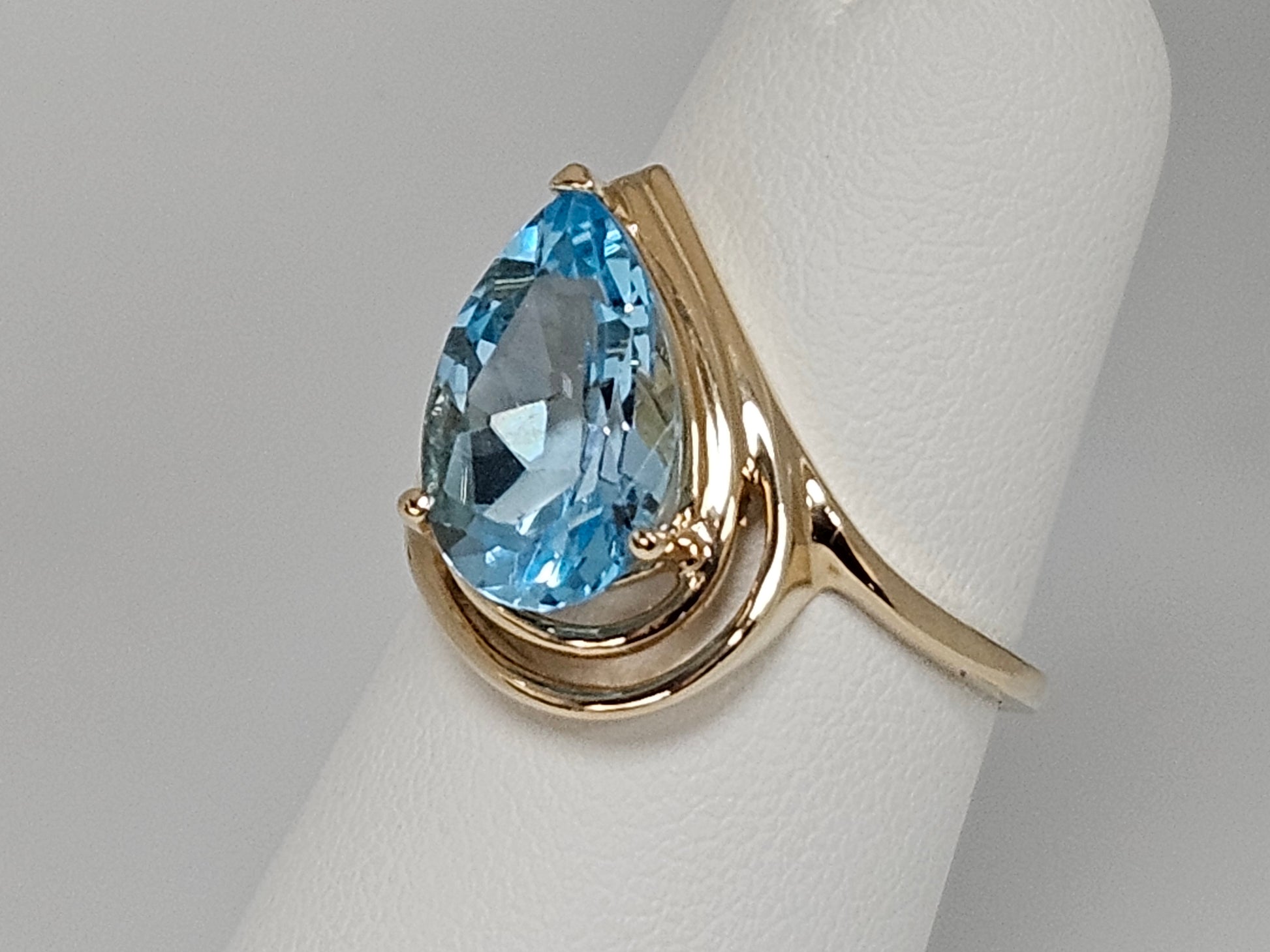 Expertly crafted with a stunning 4ct pear-shaped, Swiss Blue Topaz, this 14kt yellow gold ring exudes elegance and sophistication. The vibrant blue hue of the topaz is sure to make a statement and add a pop of color to any outfit. A must-have piece for any jewelry collection.