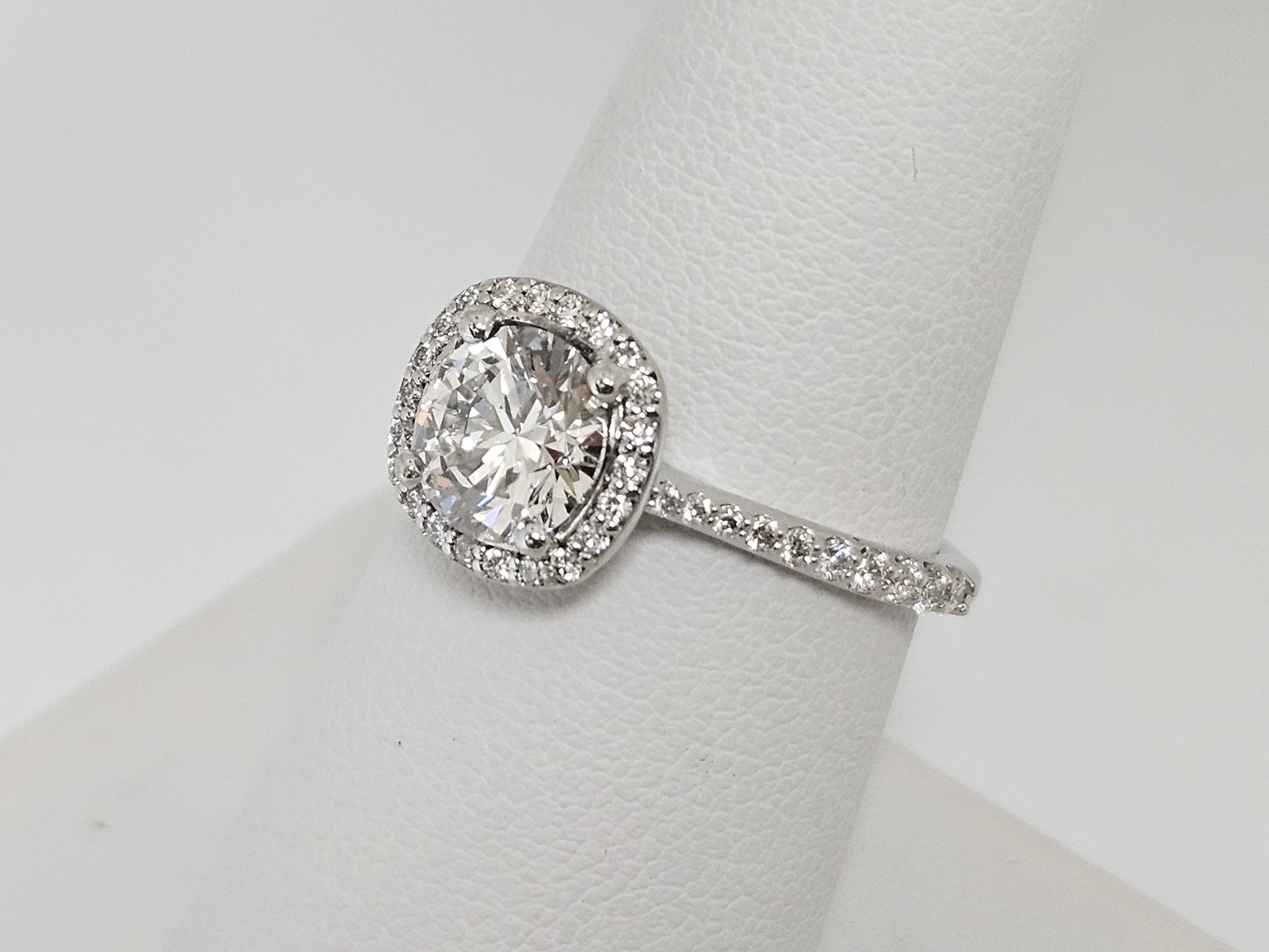 Elevate any look with our stunning round halo diamond ring. This exquisite ring features a sparkling 1.27 carat diamond center stone, surrounded by a halo of smaller diamonds and set in high-quality 14 karat white gold. Add a touch of elegance to any outfit with this timeless piece.
