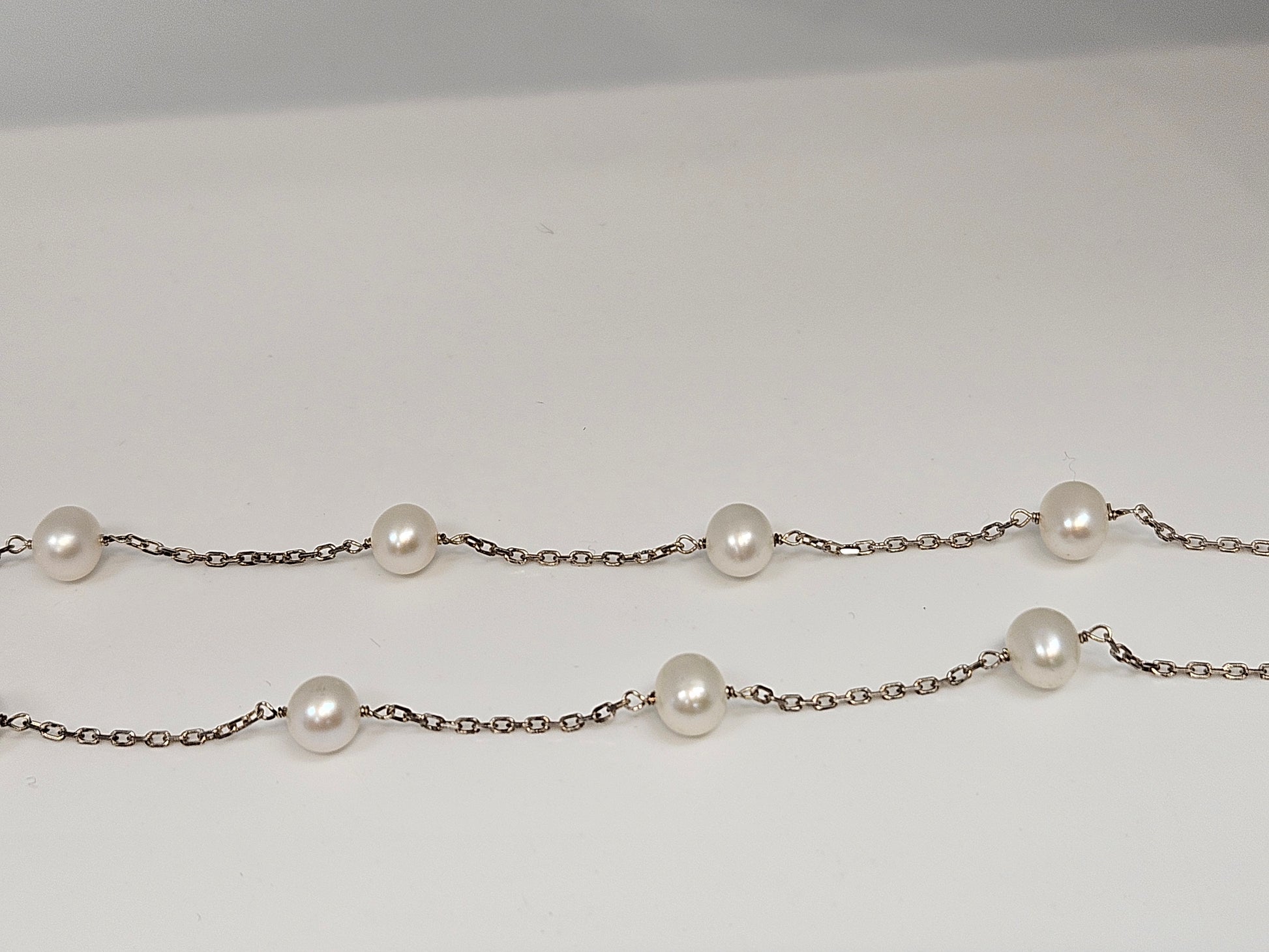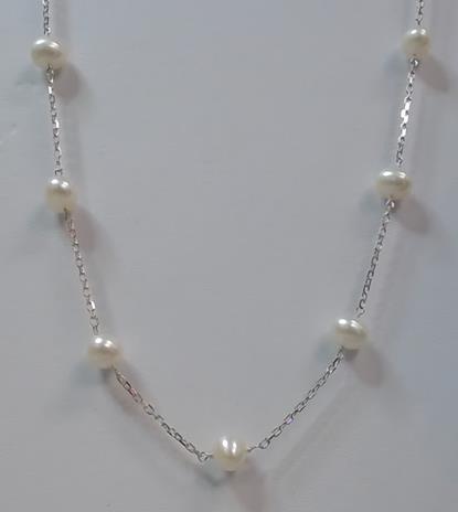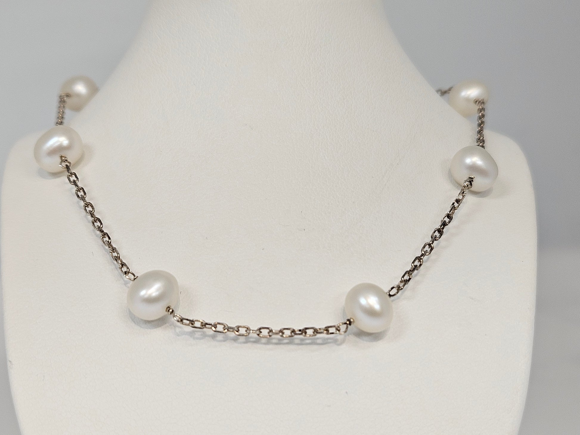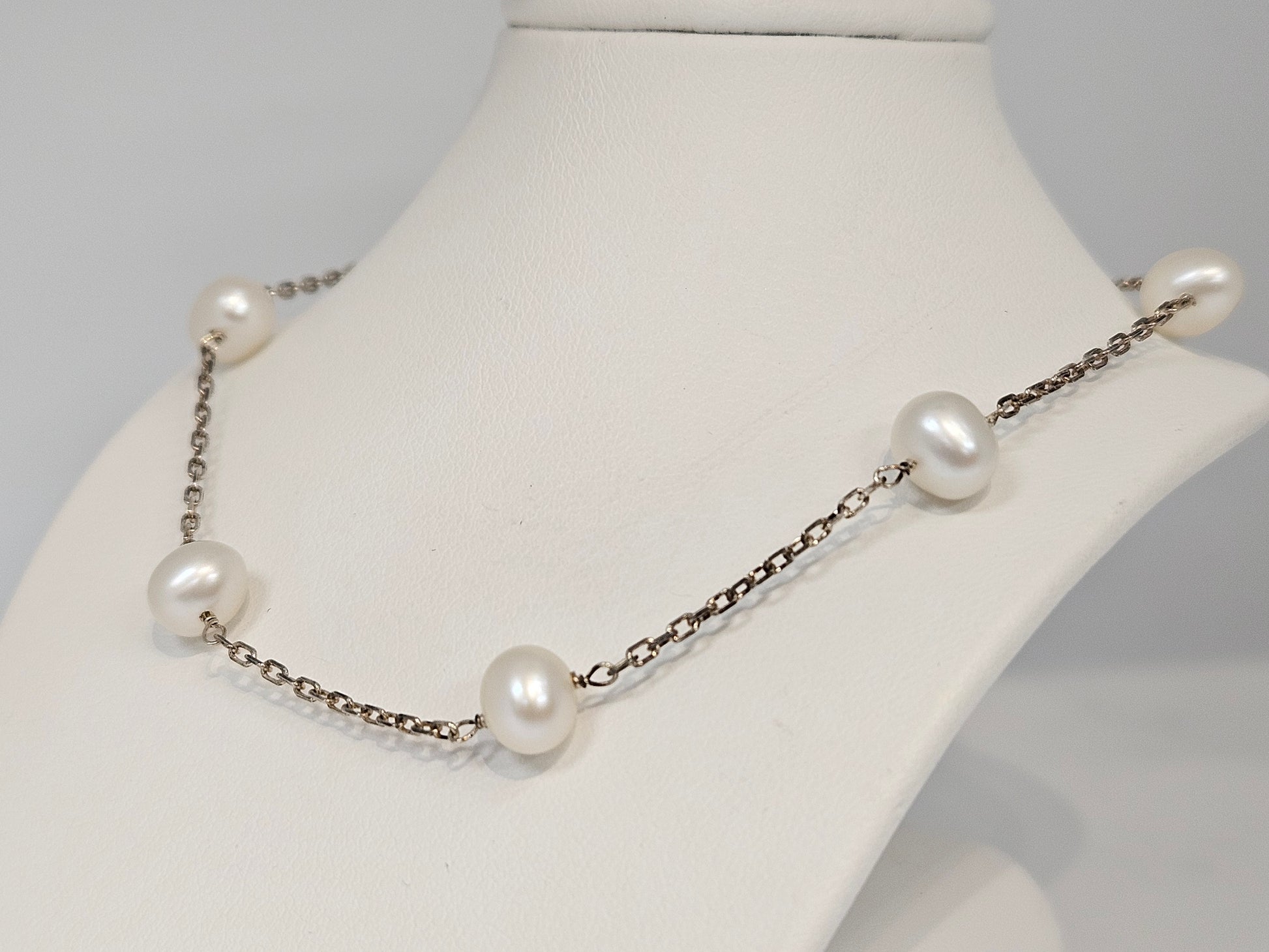 Crafted with sterling silver and natural pearls, this 18" station necklace is the perfect elegant accessory. The subtle yet classic design adds a touch of sophistication to any outfit. Embrace the timeless beauty of pearls and elevate your style with this expertly crafted necklace.