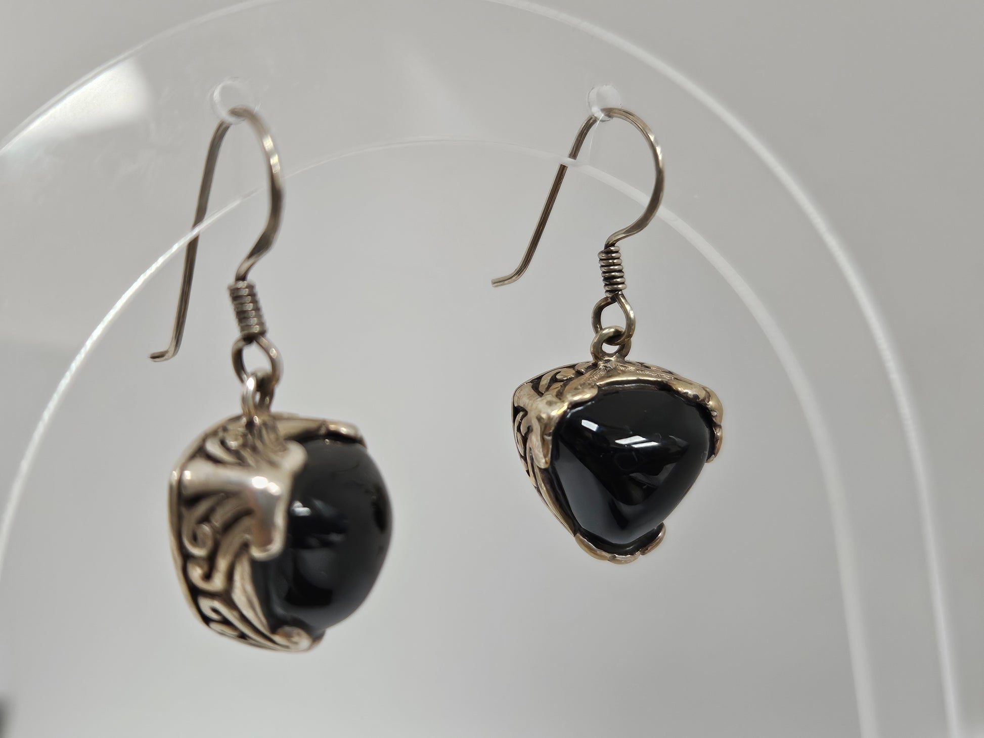Expertly crafted from high-quality sterling silver, these black stone triangle earrings are both stylish and durable. The unique triangular design is complemented by a sleek black stone, creating a modern and elegant look. Elevate any outfit with this versatile accessory.