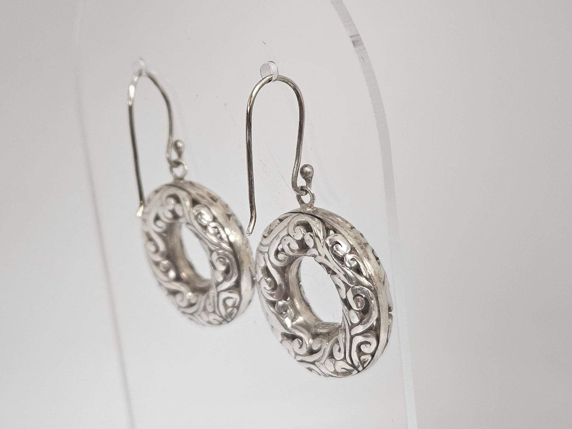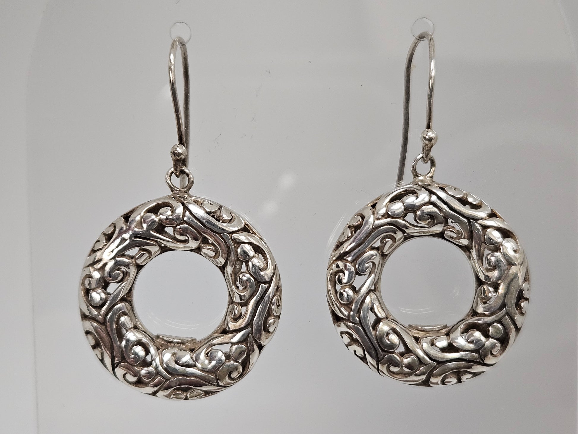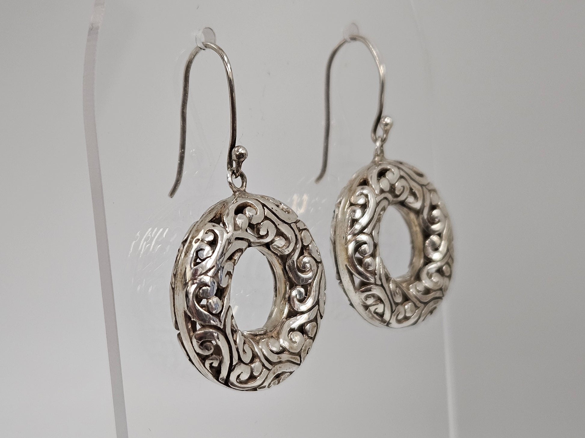 These sterling silver fancy circle earrings offer a classic yet modern look, adding a touch of elegance to any outfit. Made from high-quality materials, these earrings are designed to last. Elevate your style with these beautiful and versatile earrings.