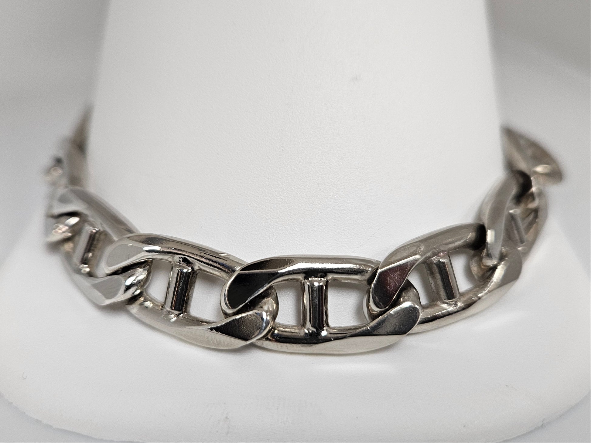 Enhance your style with the Sterling Silver Mens Anchor Bracelet. Crafted with high-quality Sterling Silver, this bracelet features a sleek and stylish anchor design. It's a timeless and durable accessory that adds a touch of sophistication to any outfit. Elevate your look and make a statement with this classic piece.