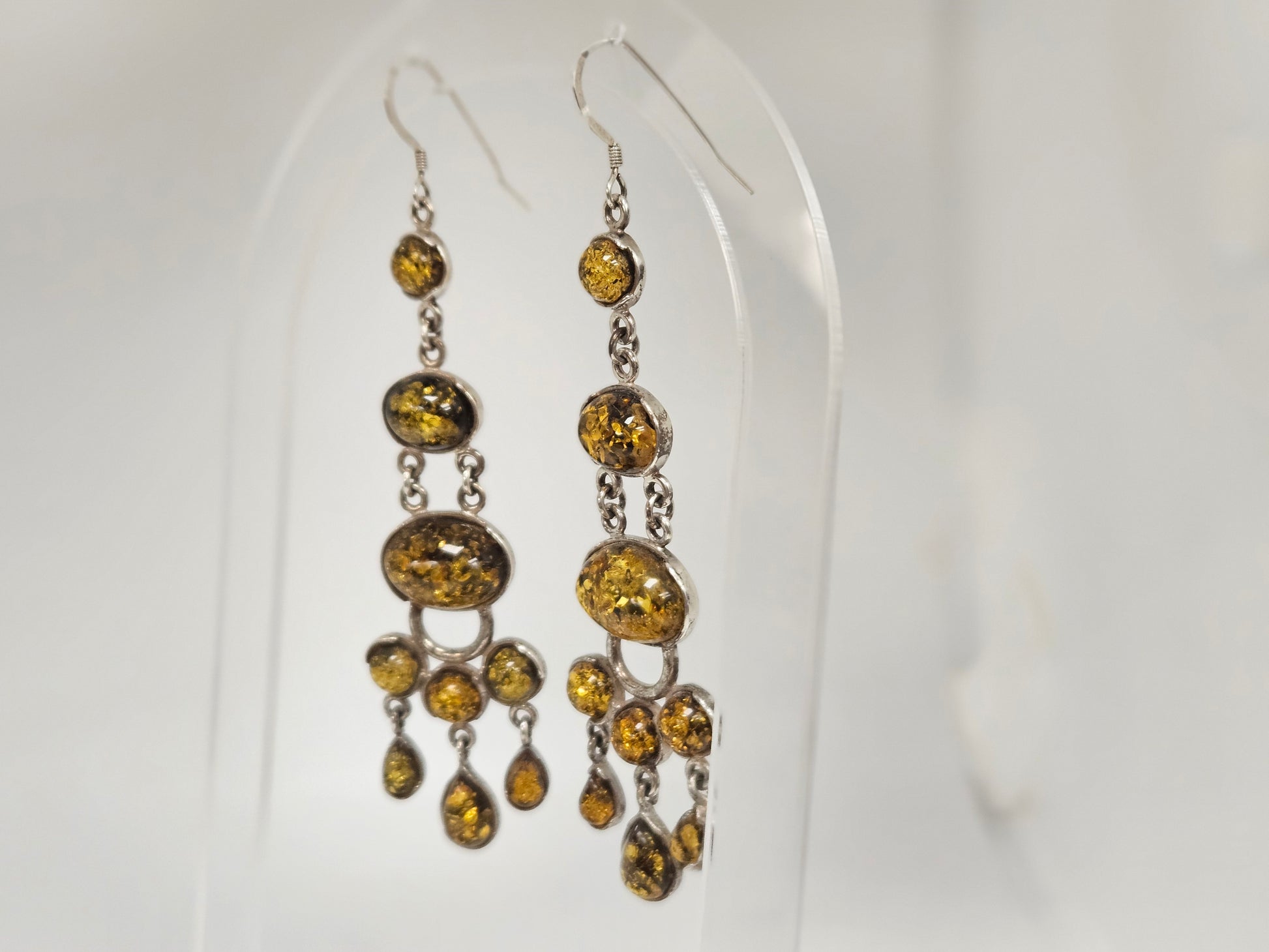 Expertly crafted in high-quality sterling silver, these yellow amber chandelier earrings are a stunning addition to any jewelry collection. The intricate chandelier design adds a touch of elegance, while the vibrant yellow amber stones provide a pop of color. Perfect for any occasion, these earrings are a must-have for every fashion-forward individual.