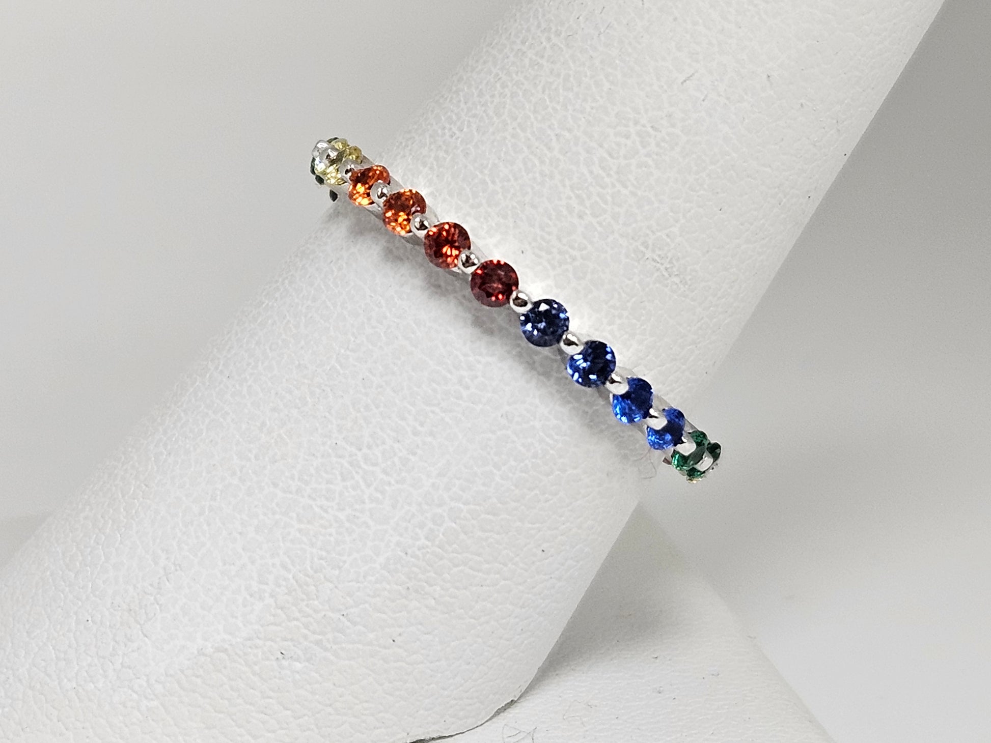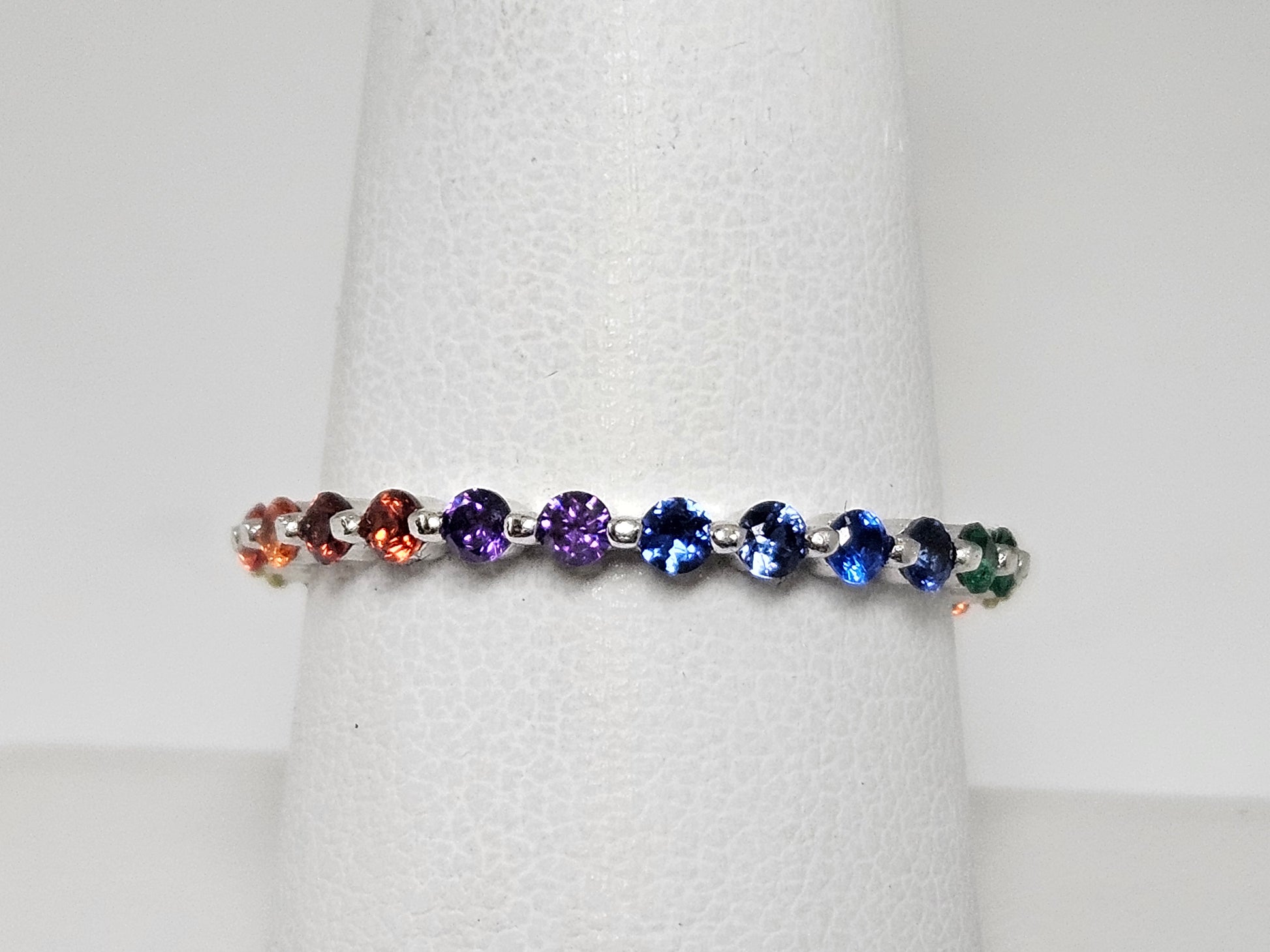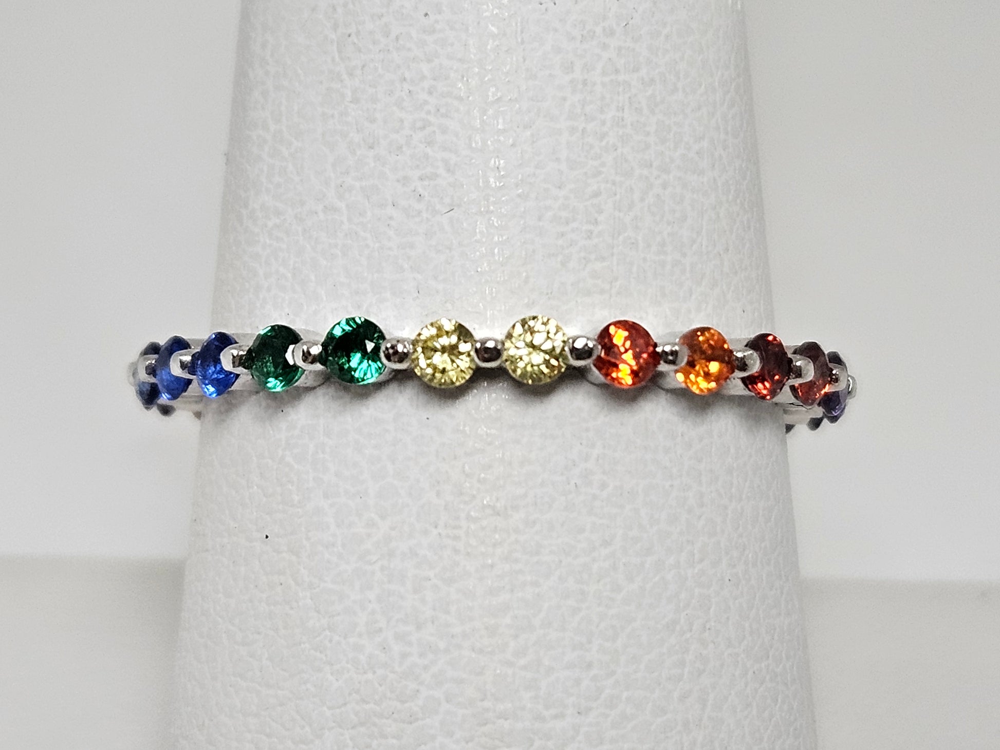 Expertly crafted from high-quality sterling silver, this Rainbow Eternity Ring is a stunning addition to any jewelry collection. With its vibrant array of colors, it adds a pop of personality to any outfit. The perfect accessory for any fashion-forward individual.