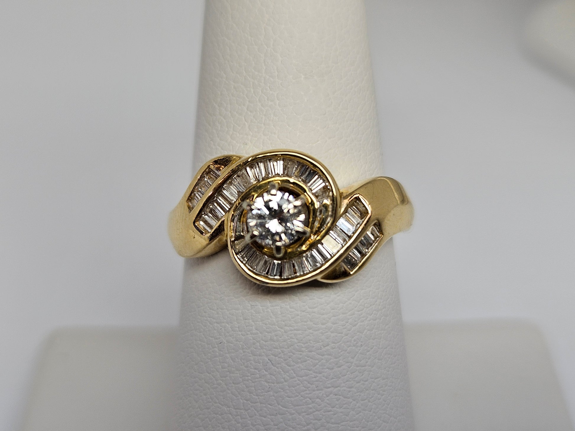 Swirl DIA Bagu/Chan Set Ring .25CT Ctr 1CTTW 14KYG