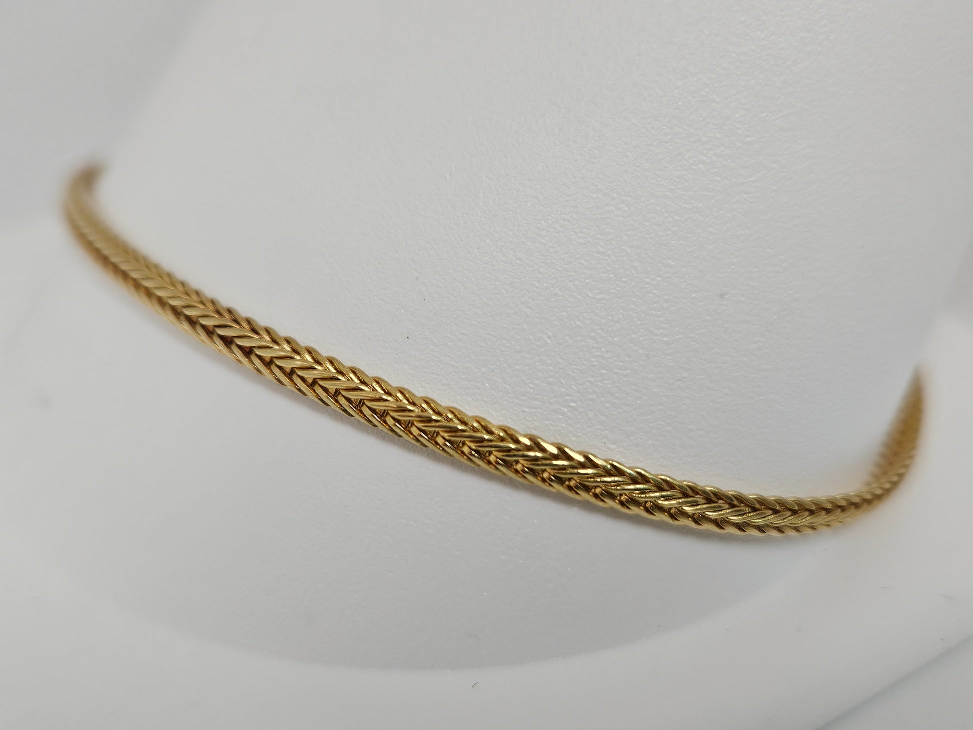 This 14k yellow gold wheat bracelet measures 8.5 inches and weighs 5.5 grams. Featuring a classic wheat design and a delicate 2.5mm width, this bracelet is a timeless accessory that adds elegance and sophistication to any outfit. With its high-quality craftsmanship and luxurious materials, this bracelet is a must-have for any jewelry collection.